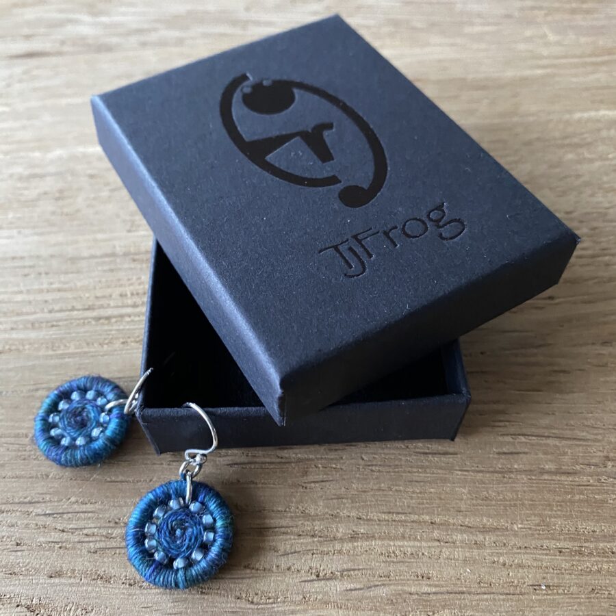 Beautiful earrings made using techniques of the heritage craft of Dorset Buttons. Yarn hand dyed in the Scottish Highlands combined with clear beads and finished off with sterling silver findings. All wrapped up in a TJFrog gift box made from recycled card and paper.