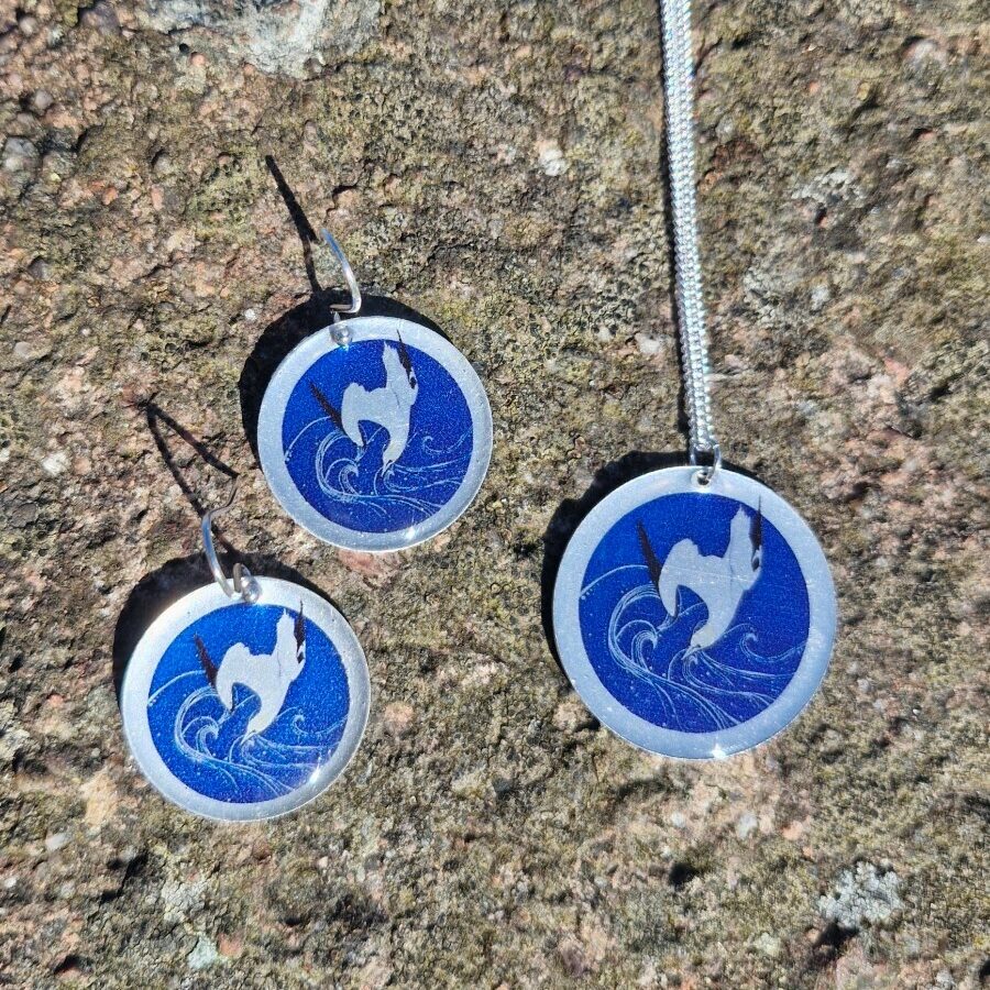 These gorgeous earrings feature "Diving Gannets" artwork by Hannah MacIver. They are made from aluminium discs with sterling silver ear wires. Hannah prints and makes the artwork transfers then slides them onto the aluminium. Once dry they are sealed in a layer of UV resin. A matching Diving Gannets pendant and cuff bracelet is also available.