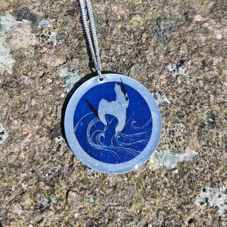 This stunning necklace features "Diving Gannets" artwork by Hannah MacIver. Hannah prints and makes the artwork transfers then slides it onto the aluminium disc. Once dry it is sealed in a layer of UV resin. It is on an 18" sterling silver chain. Matching Diving Gannets earrings and cuff bracelet are also available.