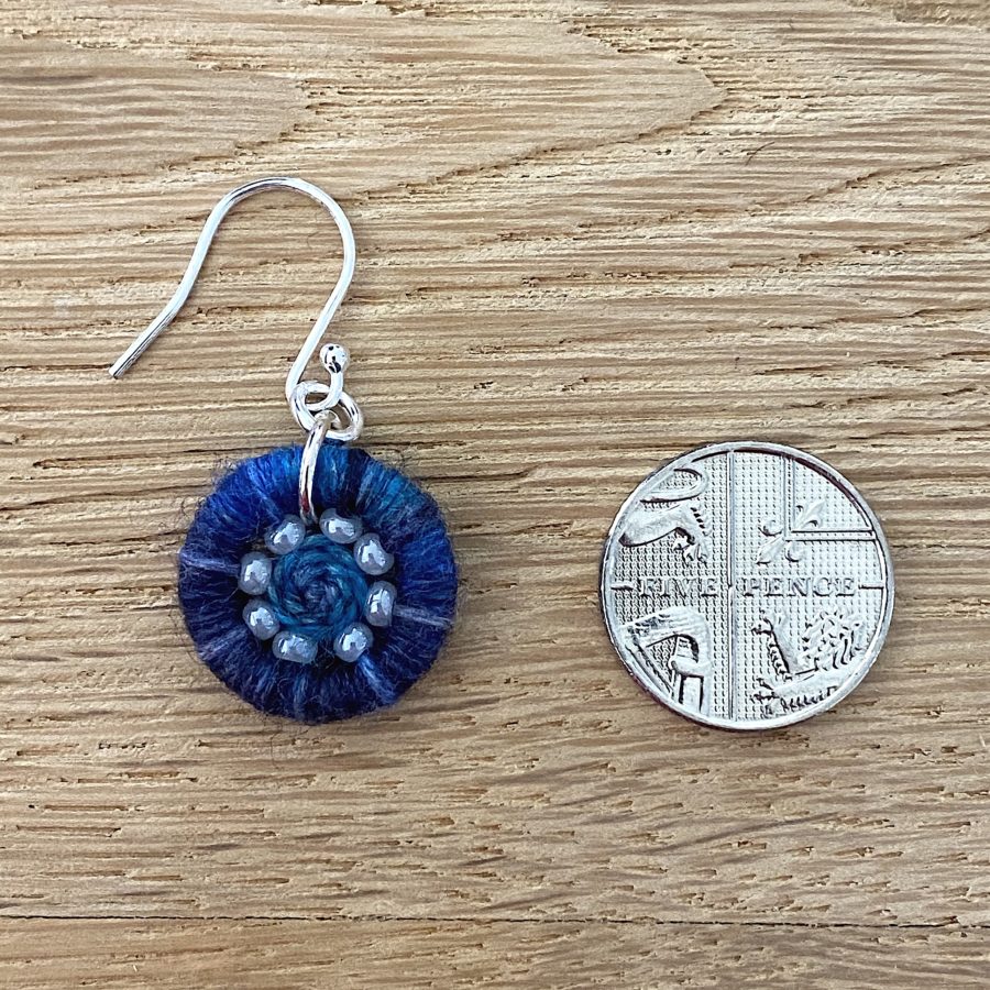 Beautiful earrings made using techniques of the heritage craft of Dorset Buttons. Yarn hand dyed in the Scottish Highlands combined with white pearl effect beads and finished off with sterling silver findings. All wrapped up in a TJFrog gift box made from recycled card and paper.