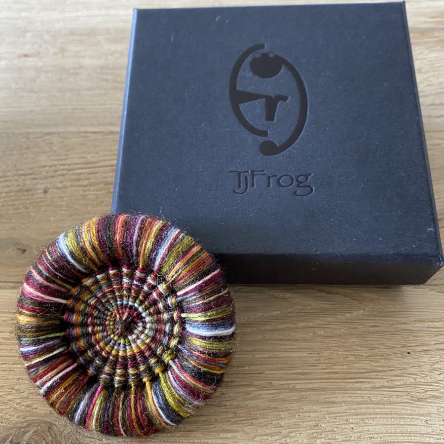 A Dorset Button Brooch made using a wooden ring and beautiful yarn hand dyed in the Scottish Highlands. Finished off with a metal brooch pin and presented in a TJFrog gift box made from recycled card and paper.