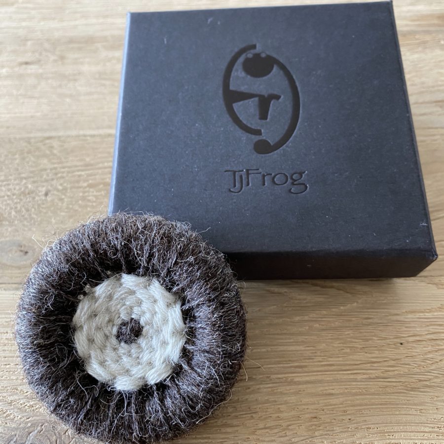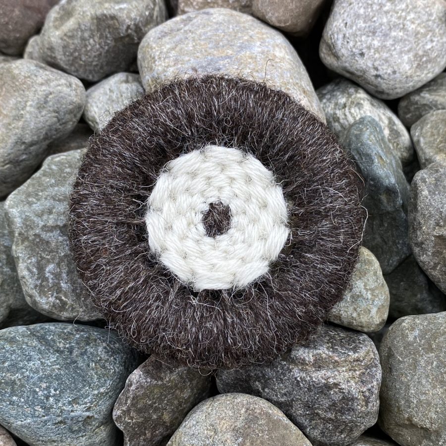 A Dorset Button Brooch made using a wooden ring with natural coloured wool, Black Cheviot and a Scottish Blackface & Cheviot mix. Finished off with a metal brooch pin and presented in a TJFrog gift box made from recycled card and paper.