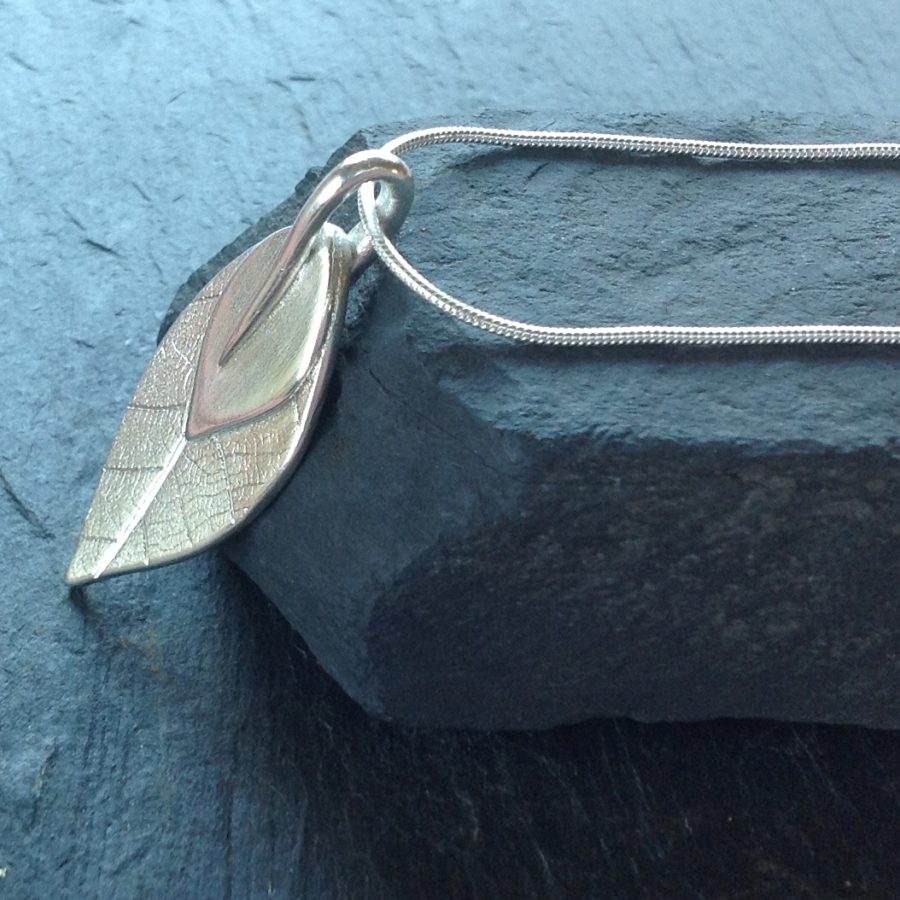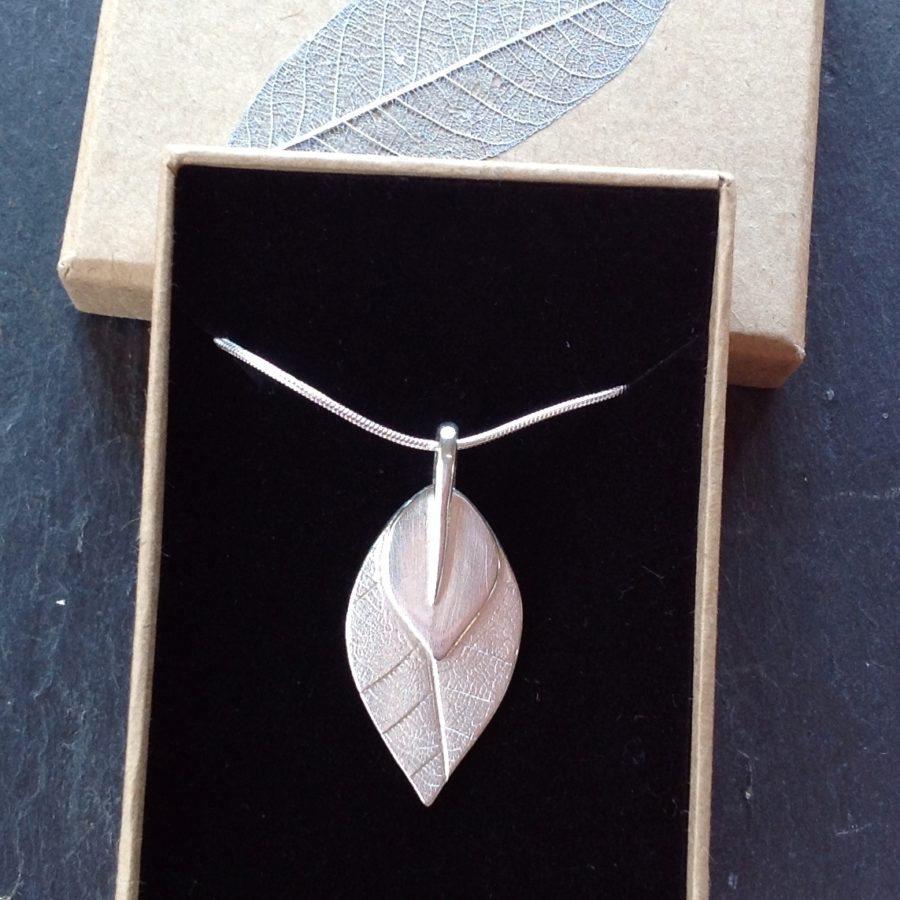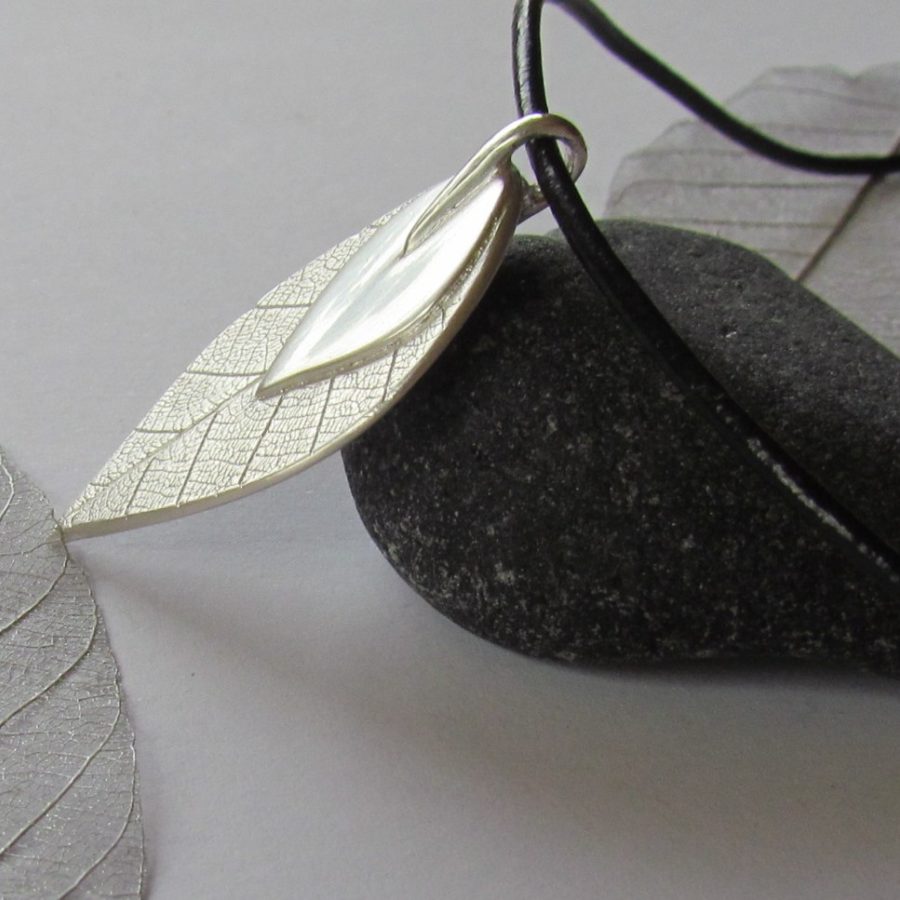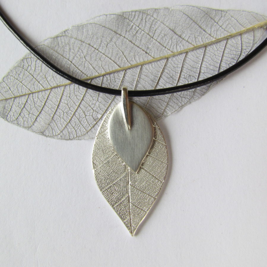 Silver double leaf metal clay necklace with vein detail and a brushed silver finish. This double leaf pendant is handcrafted with love and is a nature inspired design. The delicate leaf shape and detail on this piece is exquisite! This pendant is crafted from art silver clay and is 99.9% pure silver. You can choose to have it hung on black leather cord which compliments the silver very well or on a sterling silver snake chain which looks stunning. Both options are available in 16 or 18 inch lengths. Please state your preference in the comment box on ordering.