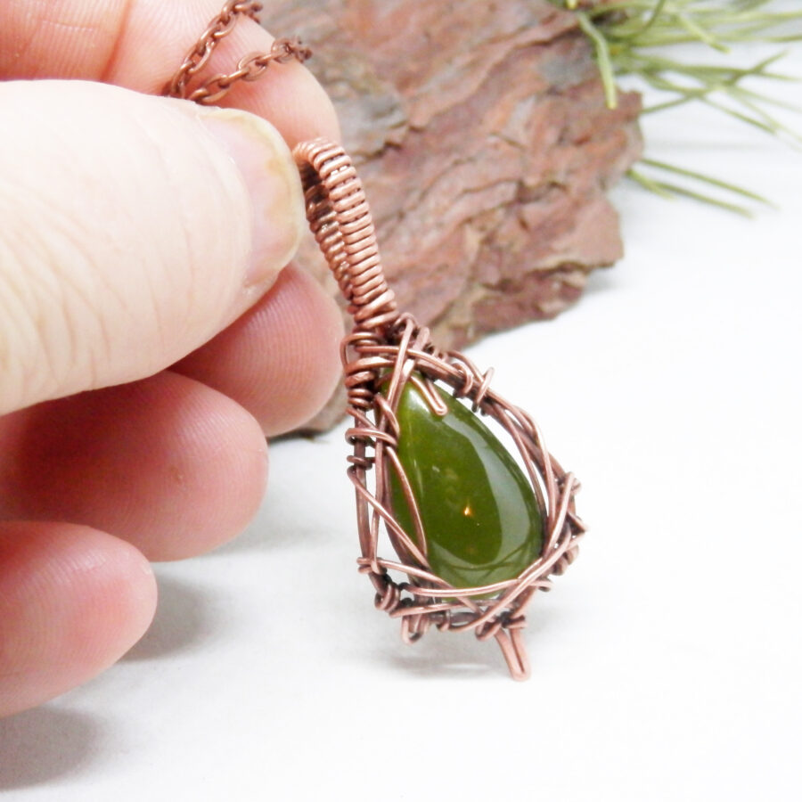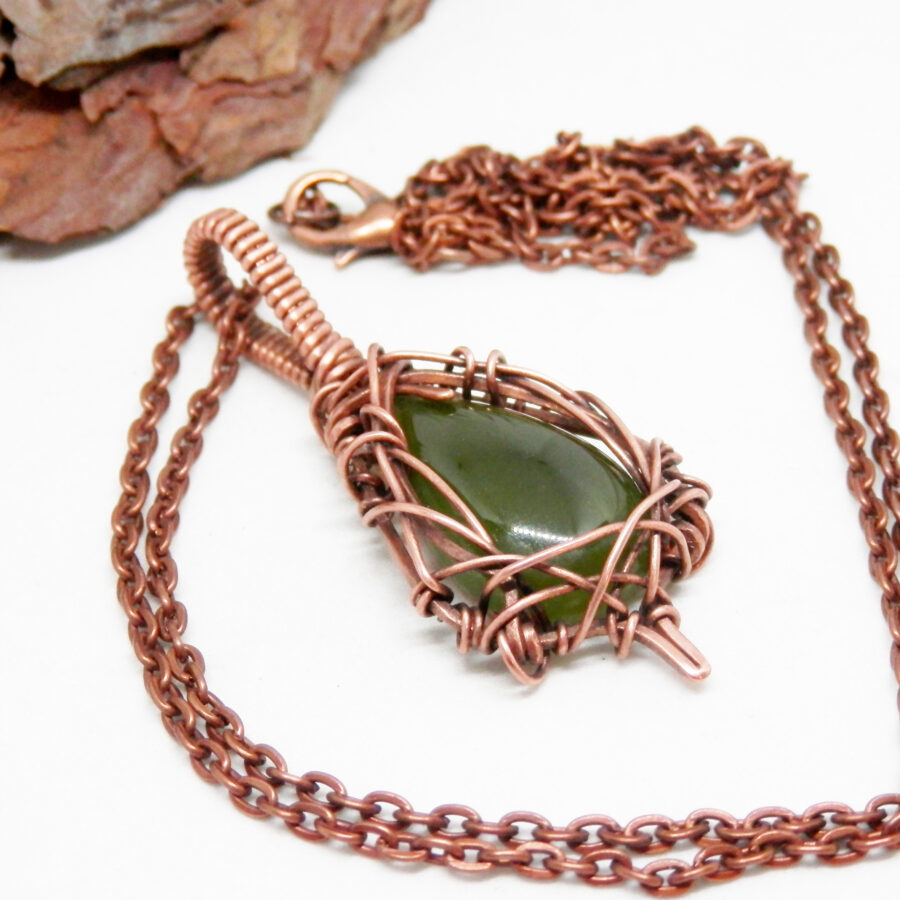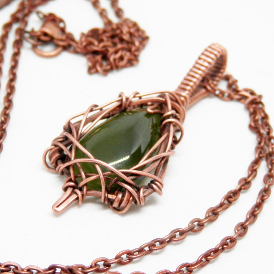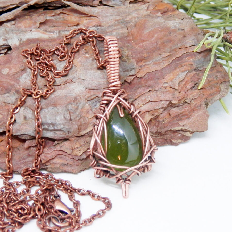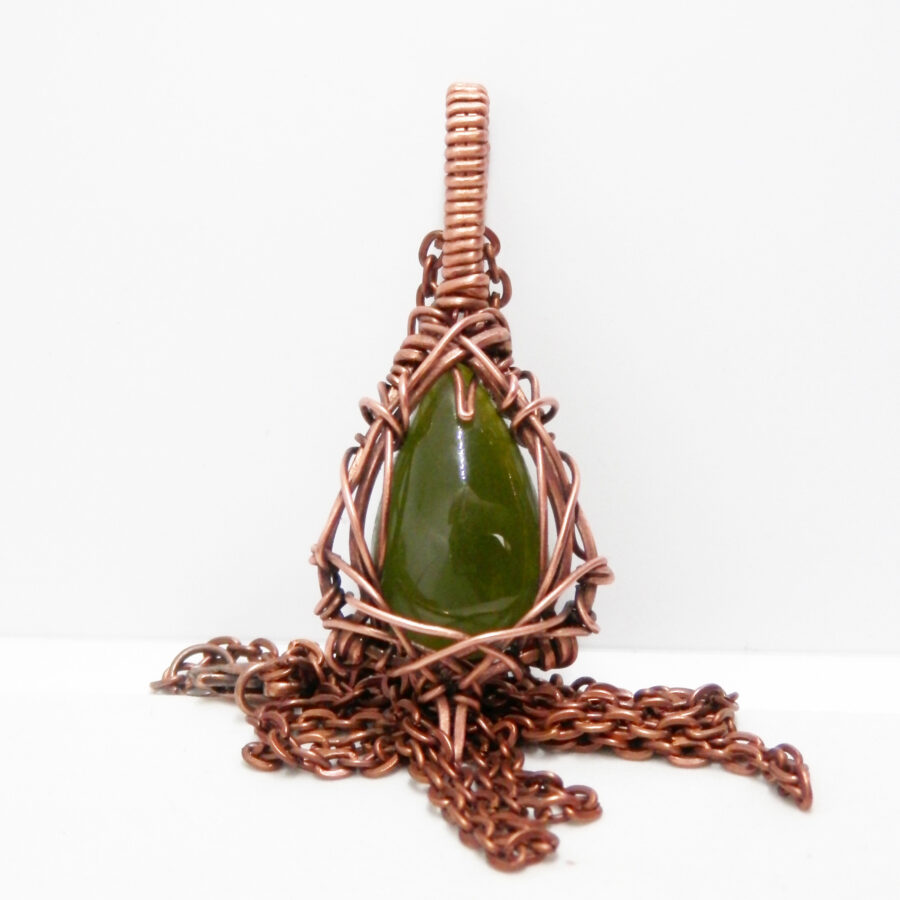 This beautiful Elven style wire wrapped necklace is made with 'antiqued' copper wire wrapped around a little green serpentine cabochon. The pendant is around 4.8 cm long by 2 cm wide and 1 cm thick at the deepest point. It comes with a 24 inch copper chain with lobster clasp. Lead and nickel free. This wire wrapped pendant will come to you placed in a soft velvet pouch.