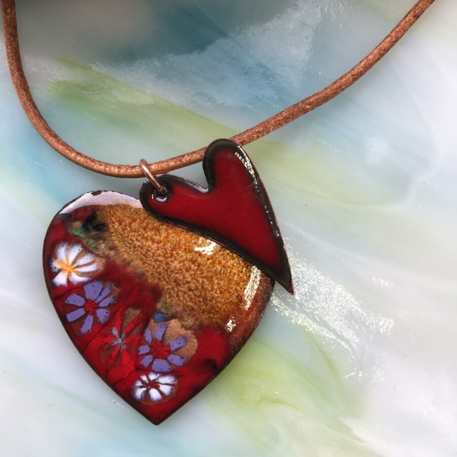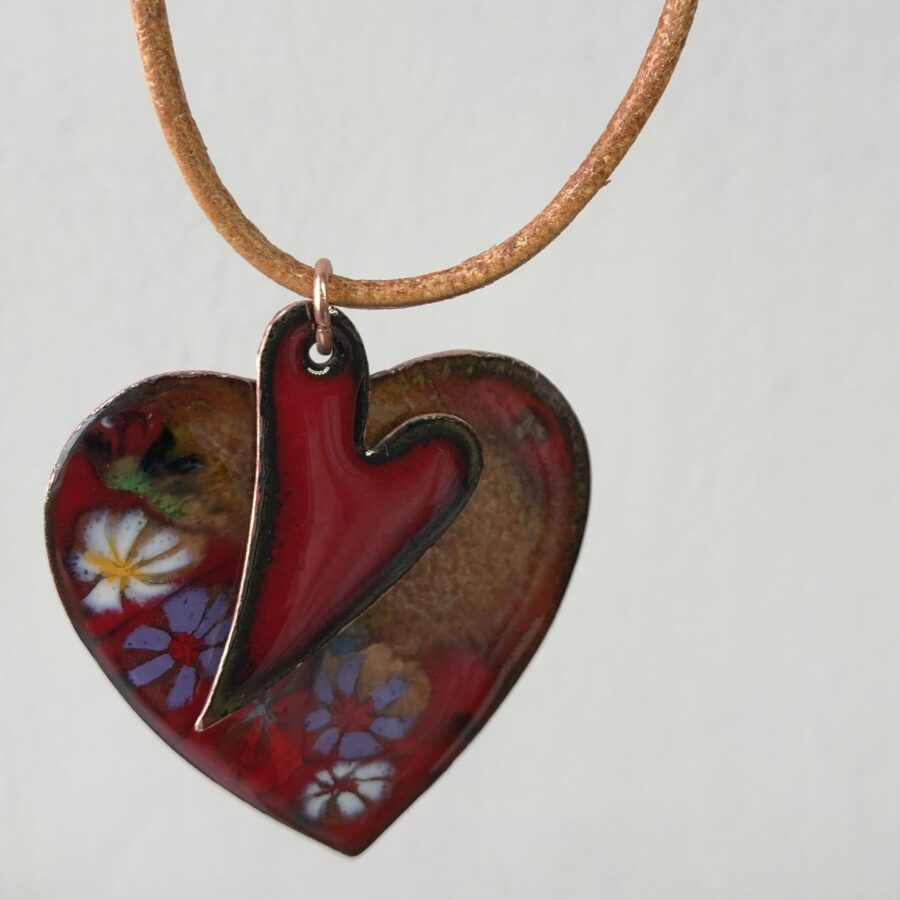 Enamelled copper two heart necklace on a leather cord. Counter enamelled on the back.