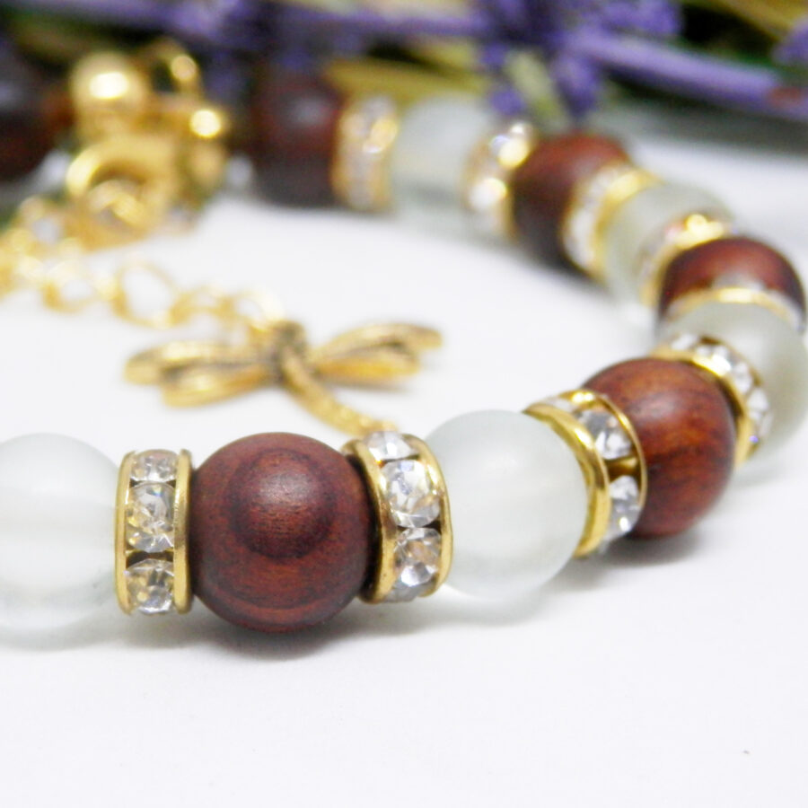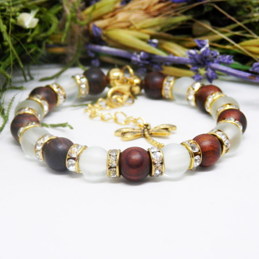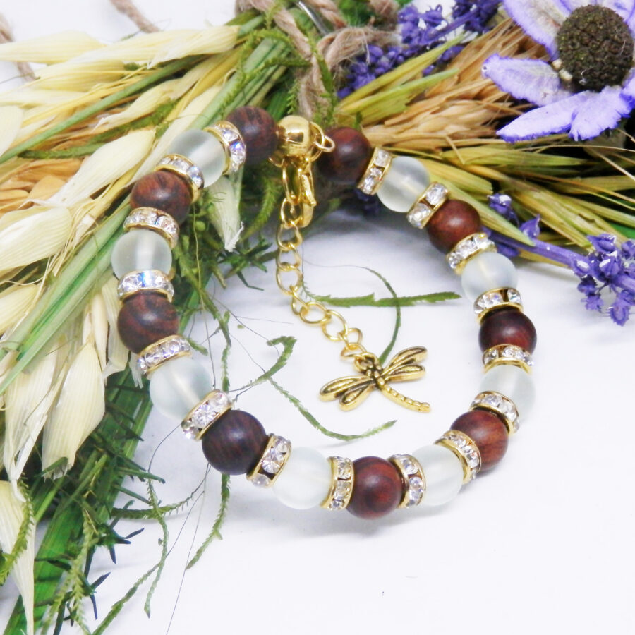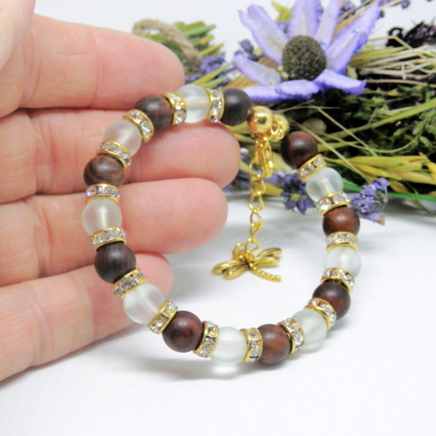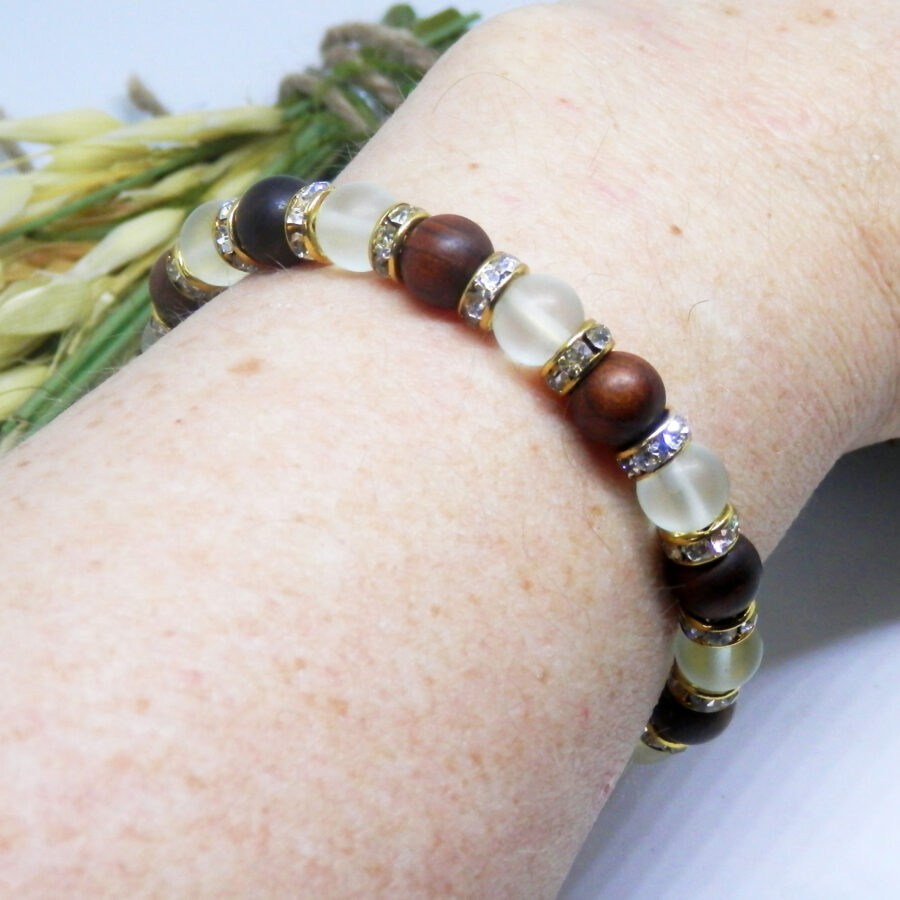 A beautiful memory wire bracelet made using gold plated wire, diamante spacers and clasp, with gorgeous frosted aquamarine beads and sandalwood beads. Nickel and lead free. It fits up to a 6.5 inch wrist, but has an extension chain for larger sized wrists. Posted in repurposed envelopes or boxes – trying to do my tiny bit for the environment by reusing my postage wrappings.