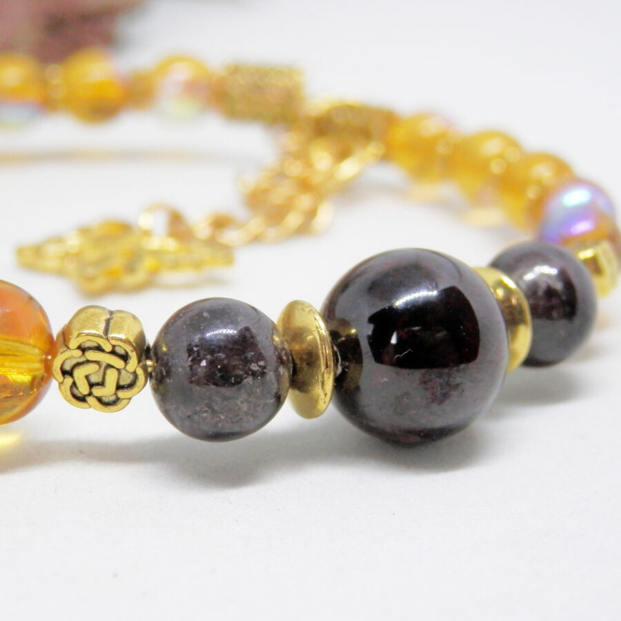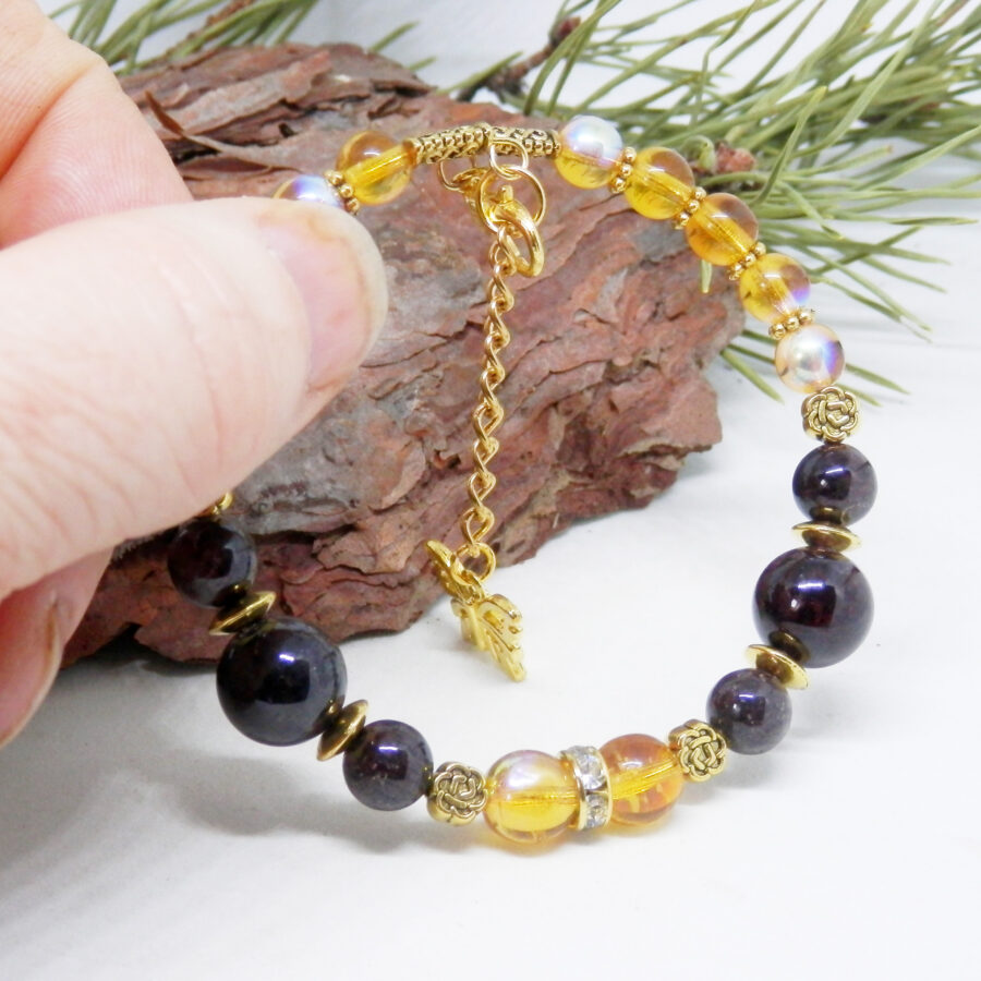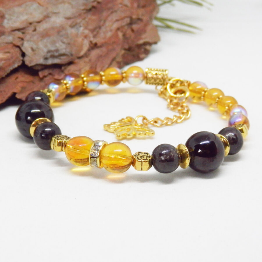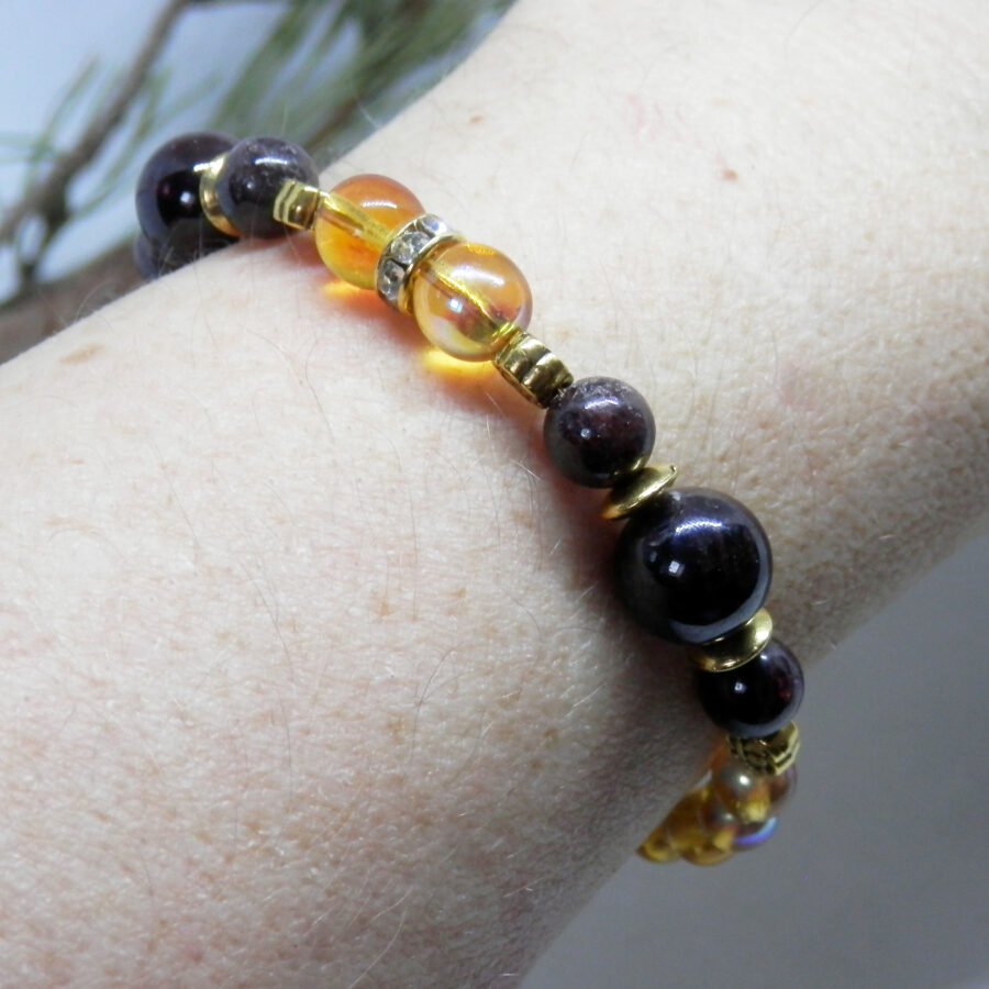A gorgeous handmade memory wire bracelet made with deep coloured red garnet and yellow citrine beads. With gold coloured spacer beads and metallic Celtic patterned beads, and a lovely butterfly charm. It would fit a 6.5 inch wrist, but comes with an extension chain for the larger wrist. Lead and Nickel Free This bracelet will come to you placed in an organza bag.