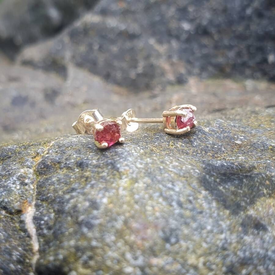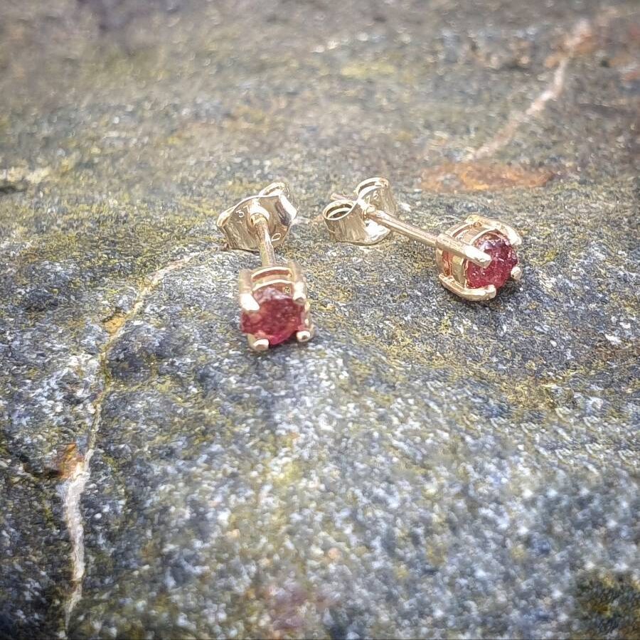 These lovely stud earrings are made with 9 carat gold and each carries a beautiful 3 mm (approx) garnet gemstone. The garnet is sourced by Saffron, found in a local river in the Highlands of Scotland. Garnet is the birthstone for January and the root Chakra. These earrings will come gift boxed.