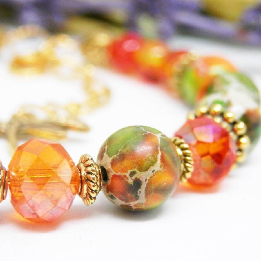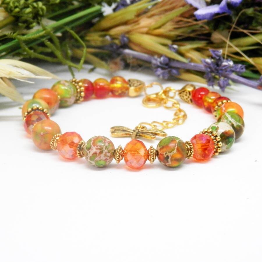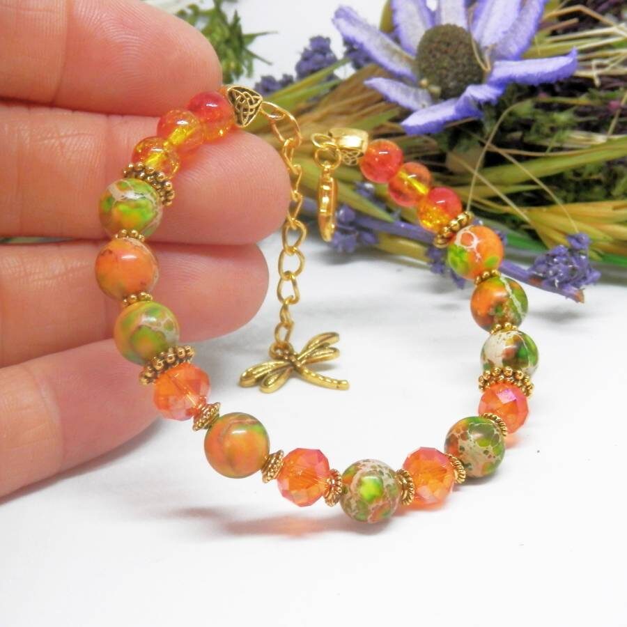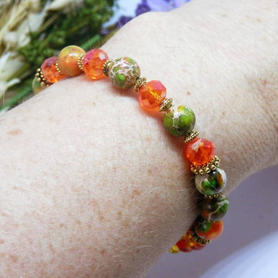 This gorgeous memory wire bracelet is made using gold plated memory wire, gold toned spacers, crackle glass and faceted glass beads and fabulous orangey-green jasper beads. Nickle and lead free. It would fit up to a 6.5 inch wrist, but comes with an extension chain for larger sizes. Comes to you wrapped in tissue, no plastic. Posted in repurposed envelopes or boxes as the maker is trying to do her tiny bit for the environment by reusing my postage wrappings.