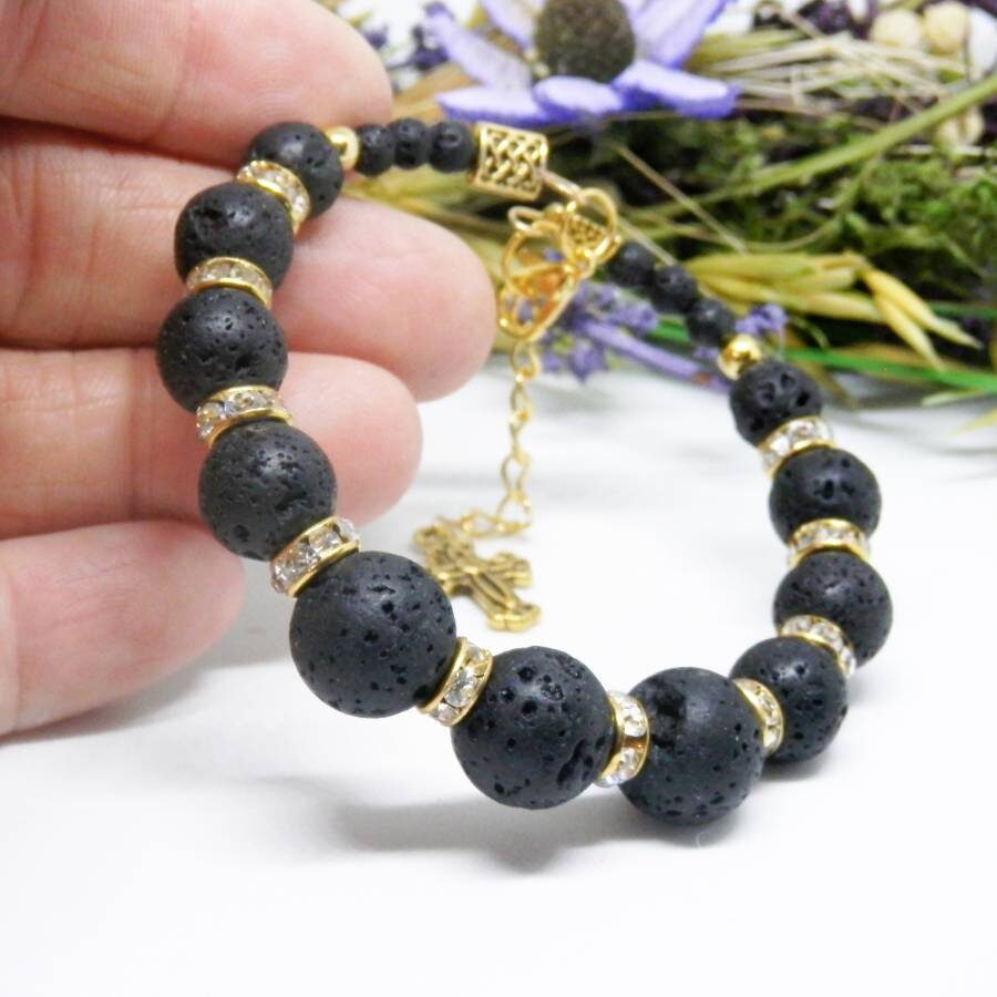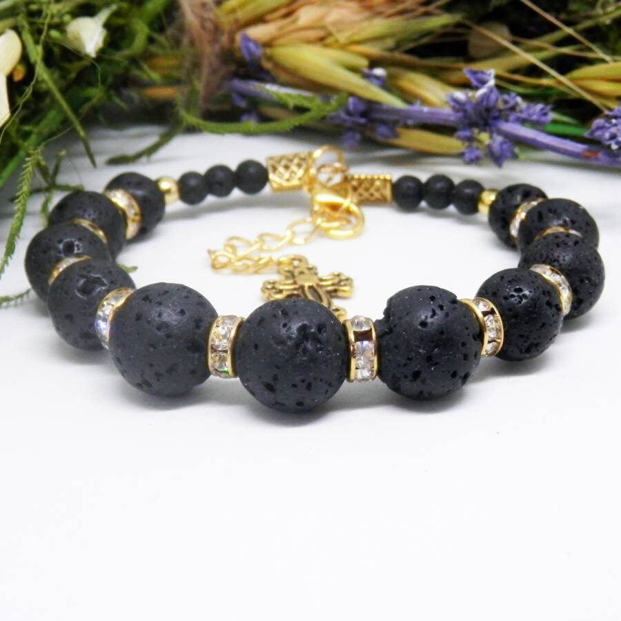 This stunning memory wire bracelet is made using gold plated memory wire, gold plated diamante spacers, gold toned Celtic patterned beads and lots of lovely lava beads. Nickle and lead free. It would fit up to a 7 inch wrist, but comes with an extension chain for larger sizes. Comes to you wrapped in tissue, no plastic. Posted in repurposed envelopes or boxes as the maker is trying to do her tiny bit for the environment by reusing my postage wrappings.