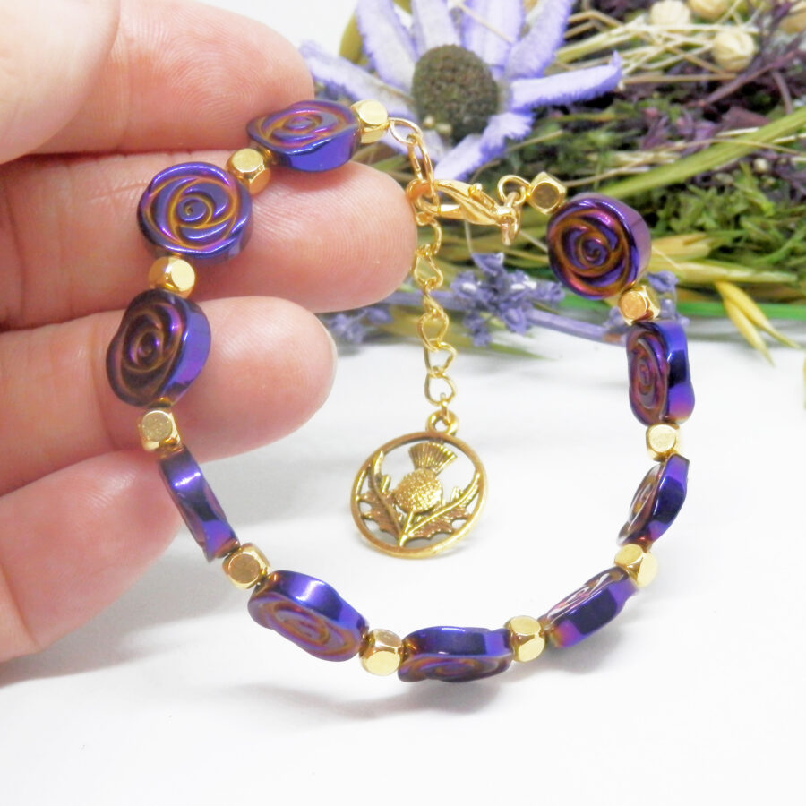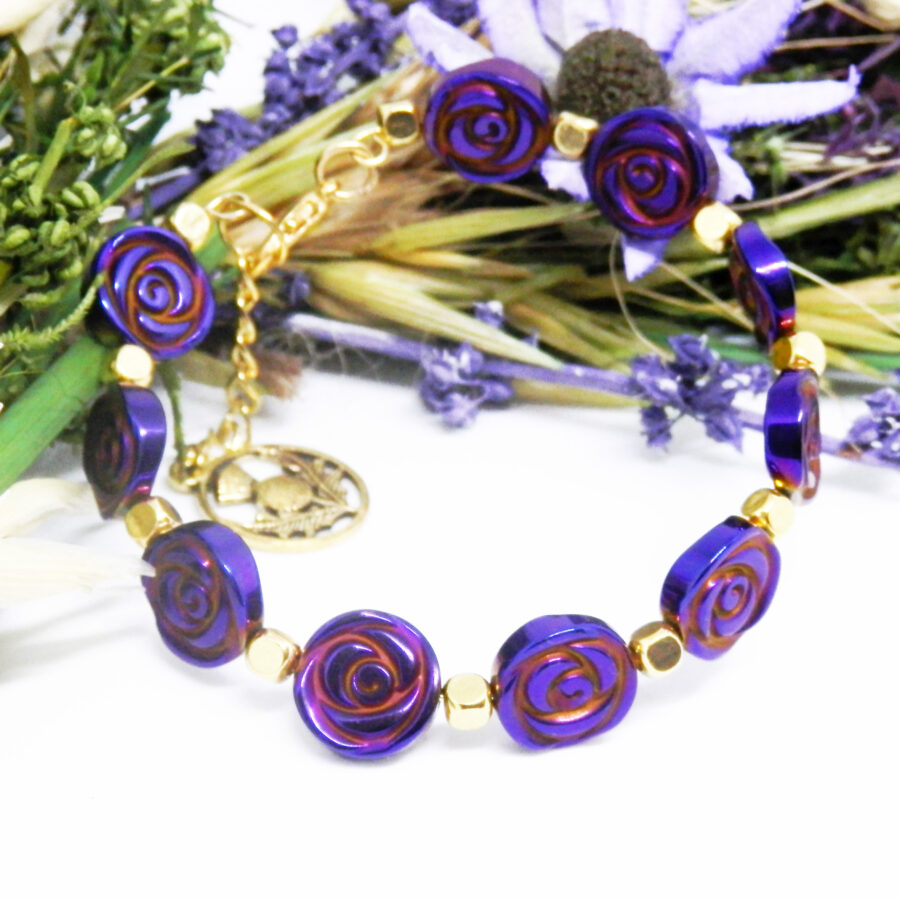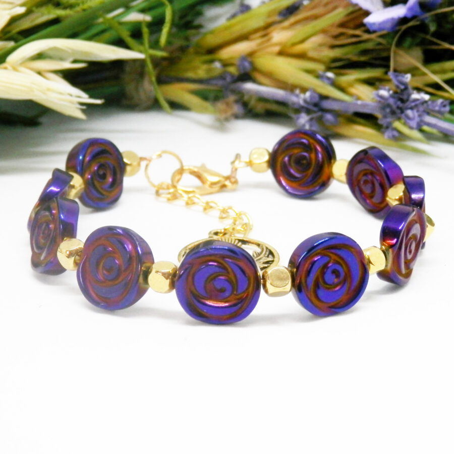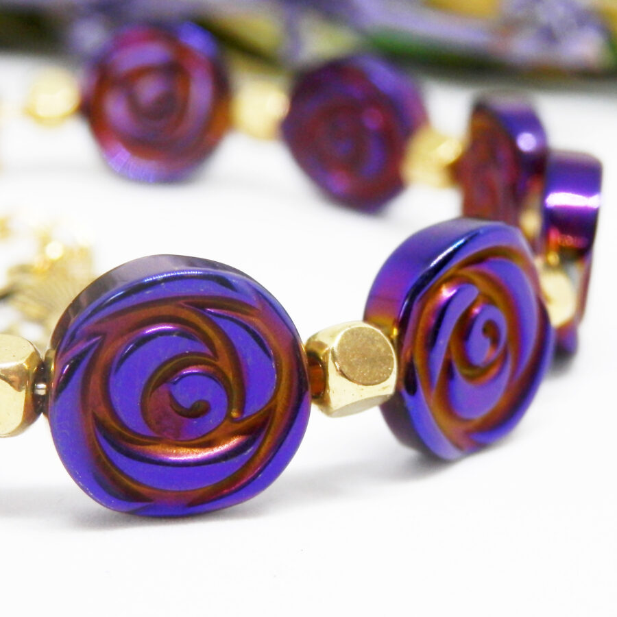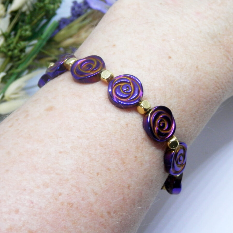 A gorgeous memory wire bracelet made using gold plated wire, cube shaped spacers and clasp, with fabulous electroplated purple coin style beads with rose pattern in the style of Charles Rennie Mackintosh beads. Nickel and lead free. Would fit up to a 6.5 inch wrist, but has an extension chain for larger sized wrists. Posted in repurposed envelopes or boxes – trying to do my tiny bit for the environment by reusing my postage wrappings.
