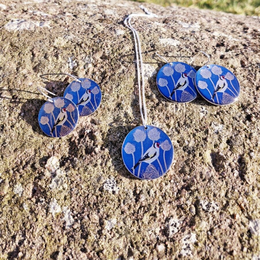 These gorgeous earrings feature "Goldfinch on Teasels" artwork by Hannah MacIver. They are made from aluminium discs with sterling silver ear wires. Hannah prints and makes the artwork transfers then slides them onto the aluminium. Once dry they are sealed in a layer of UV resin. A matching Goldfinch on Teasels Pendant is also available.