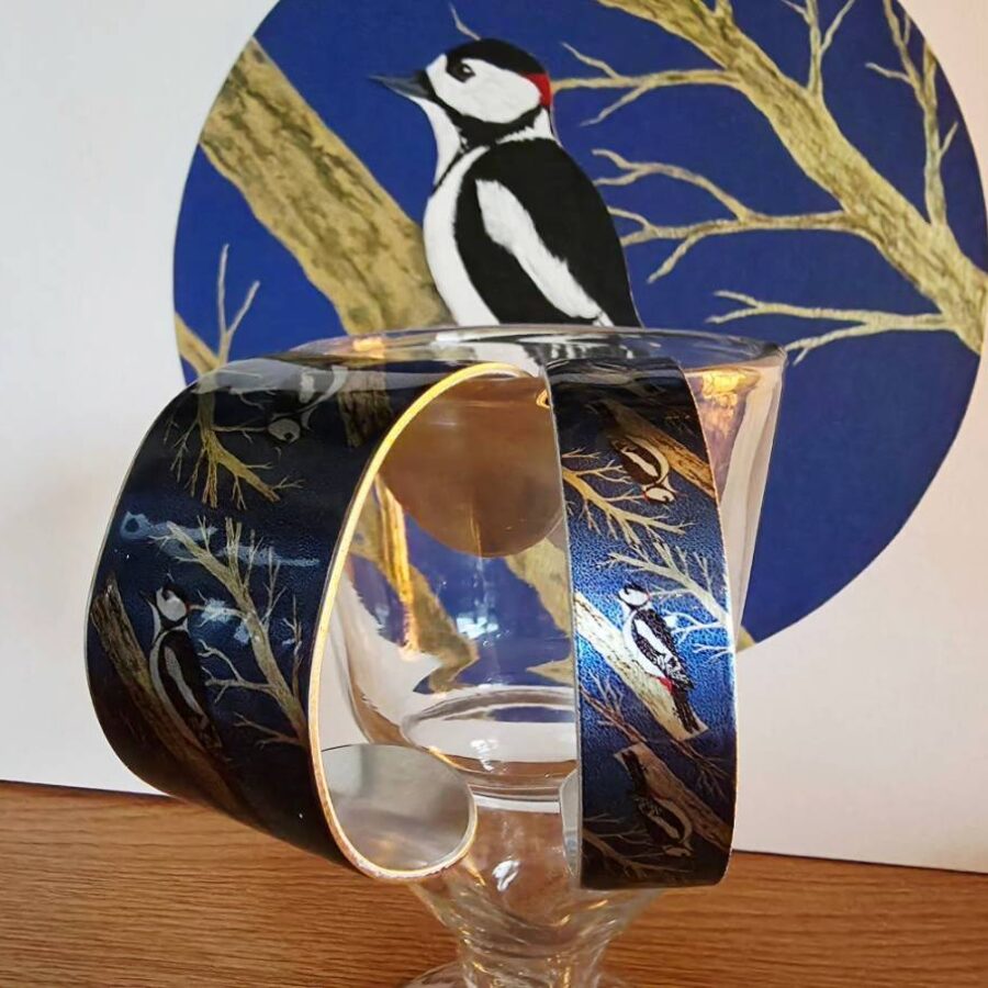 This gorgeous cuff bracelet features "Great Spotted Woodpecker" artwork by Hannah MacIver. It is made from aluminium. Hannah prints and makes the artwork transfers then slides them onto the aluminium she has previously bent into the cuff shape. Once dried she sands the edges and seals them with a coat of UV resin. As these are handmade the finish for each will be slightly differently. Available as narrow or wide cuff, select your preference using the drop down menu.