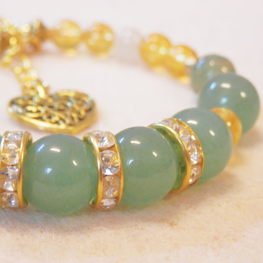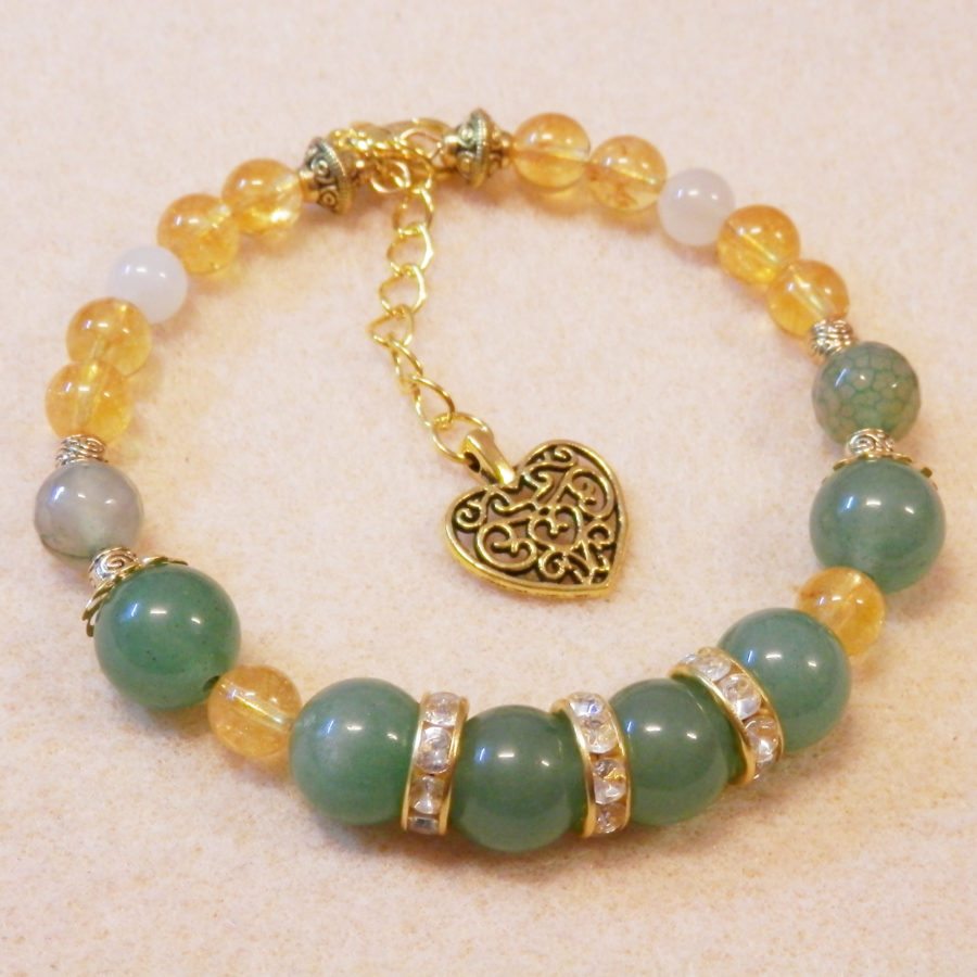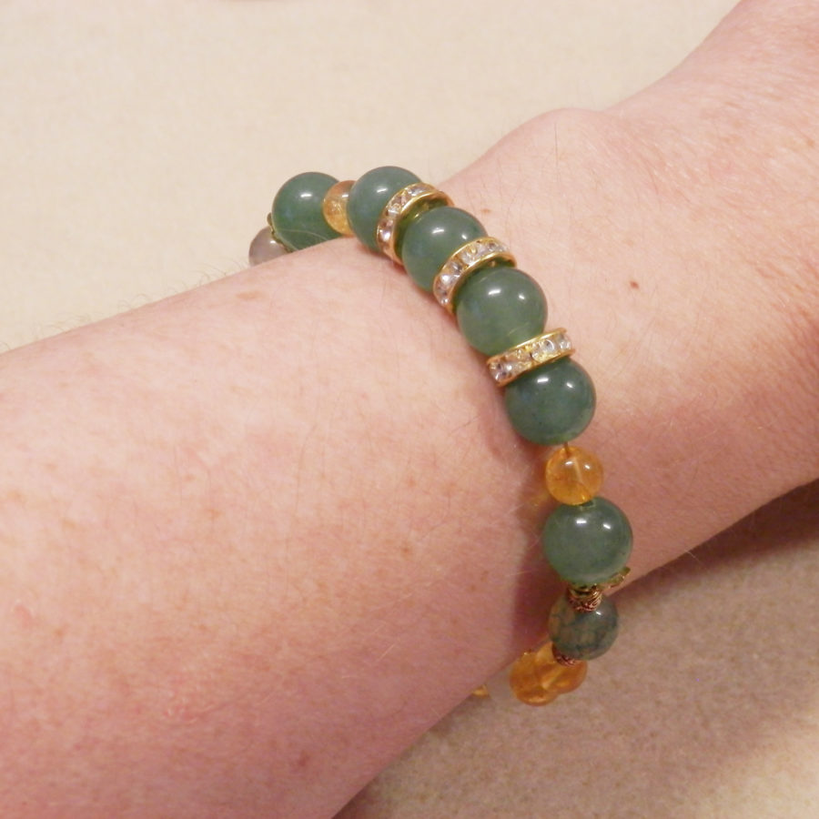 Beautiful hand made bracelet with green aventurine, citrine and moonstone gemstone beads, diamante spacers and metallic Celtic patterned beads. All assembled onto memory wire that retains it's shape forever! This bracelet fastens with a lobster clasp and comes with an extension chain for the larger wrist. Would fit around 7.5 inch typically. Comes to you in a black gift box with padded insert. Lead and nickel free