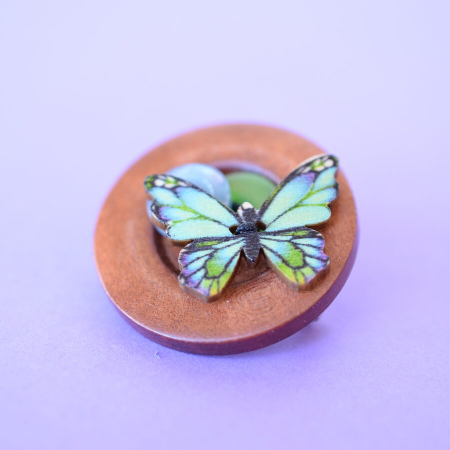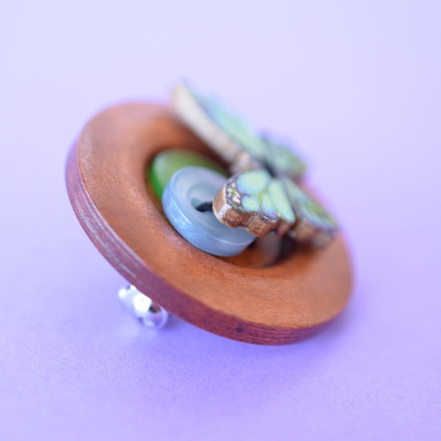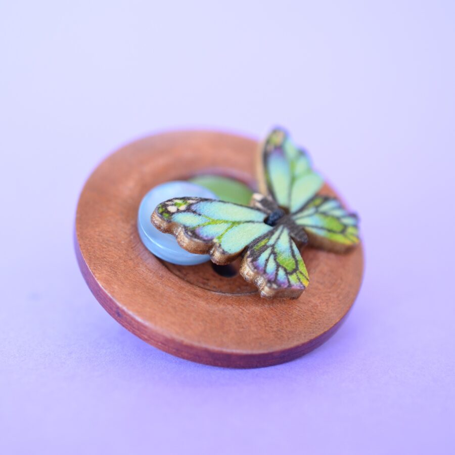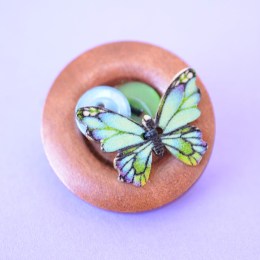 Lovely wooden butterfly button with coordinating plastic buttons mounted on a large 35mm rich brown wooden button. Fastens with a one-inch brooch pin. This can be worn as a brooch or as a shawl pin or pop it on a bag or a hat and comes supplied in a gift pouch.