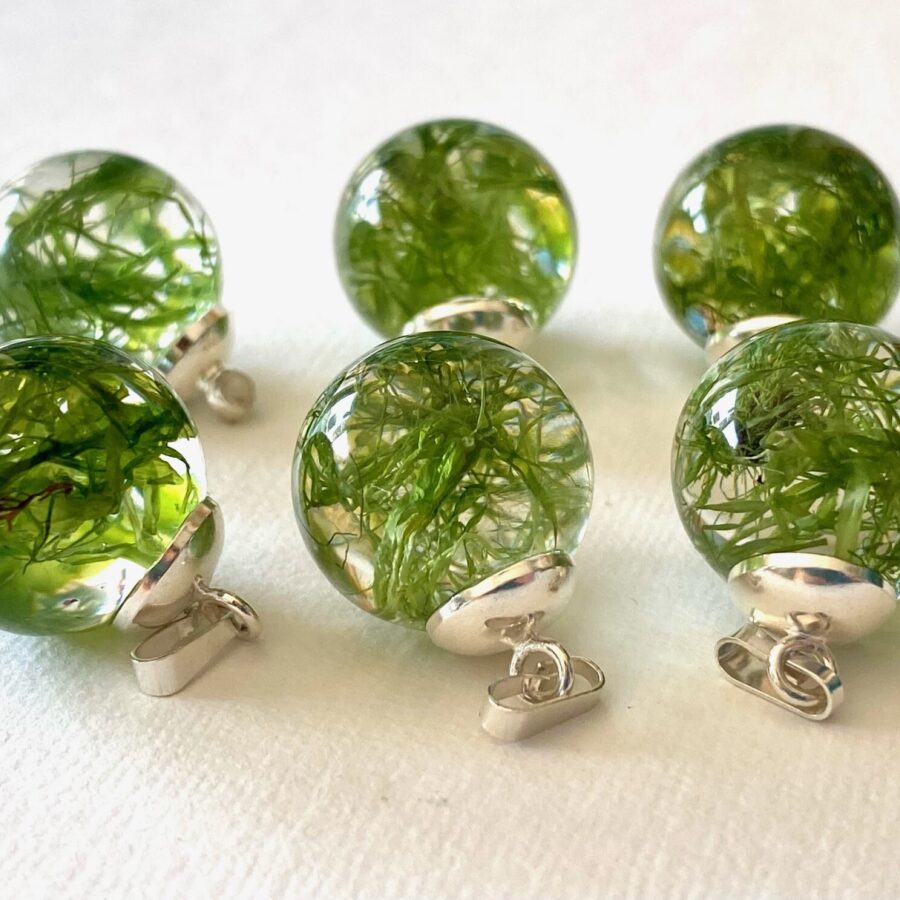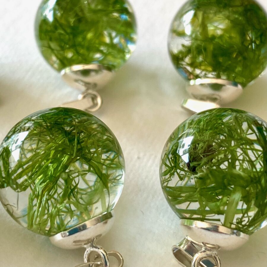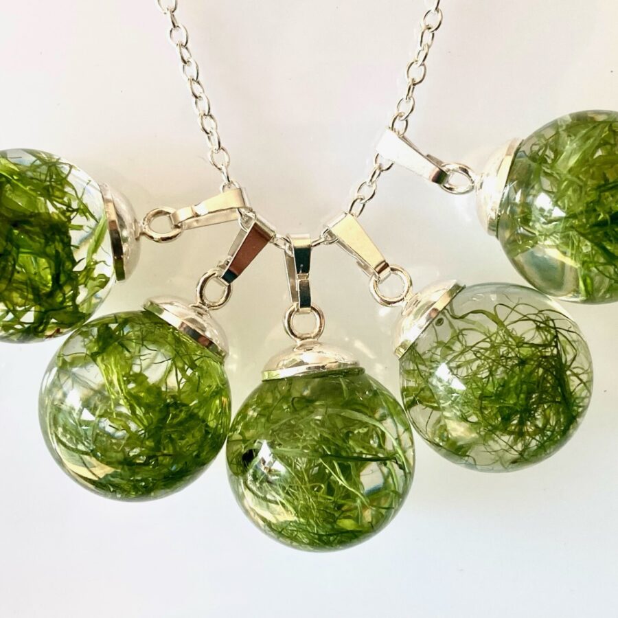 This beautiful and unique pendant features green sea lettuce encased in a resin ball, and hangs from an 18" sterling silver chain. It comes gift boxed.