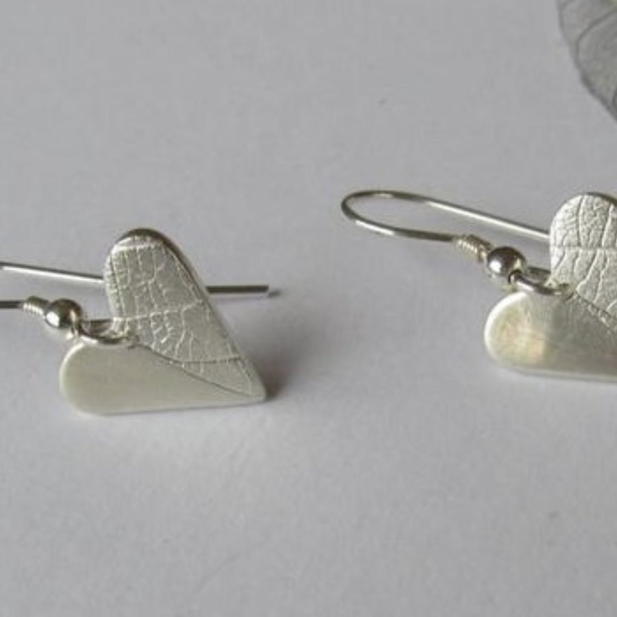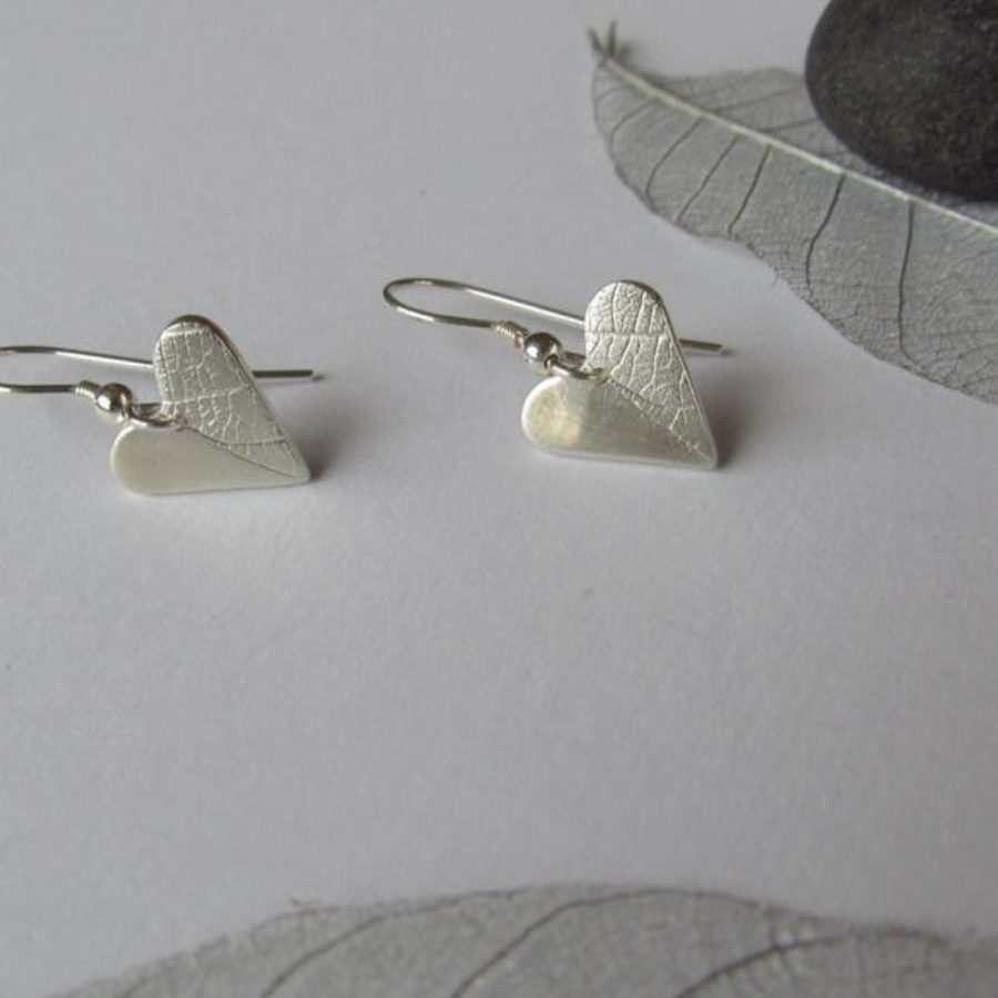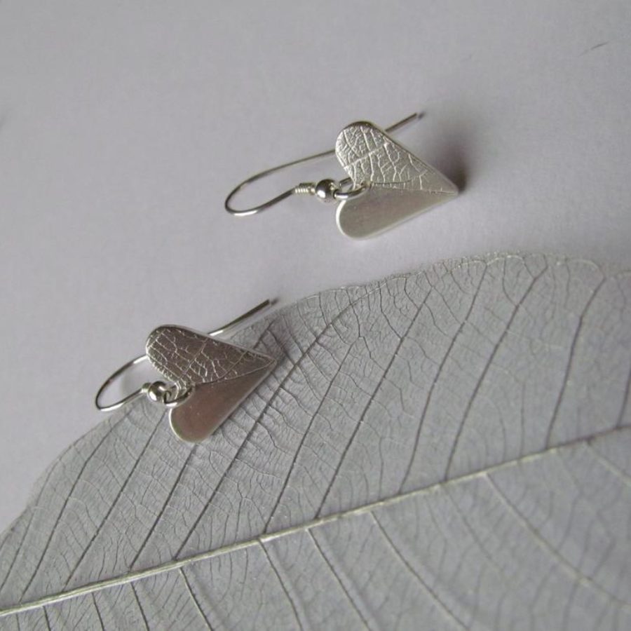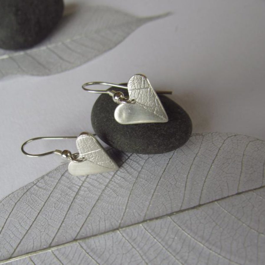 These leaf imprinted heart shaped earrings are very cute and have a brushed finish on one side and a mirror shine on the other. The love of nature is illustrated in little heart shaped earrings with a lovely detailed leaf print.