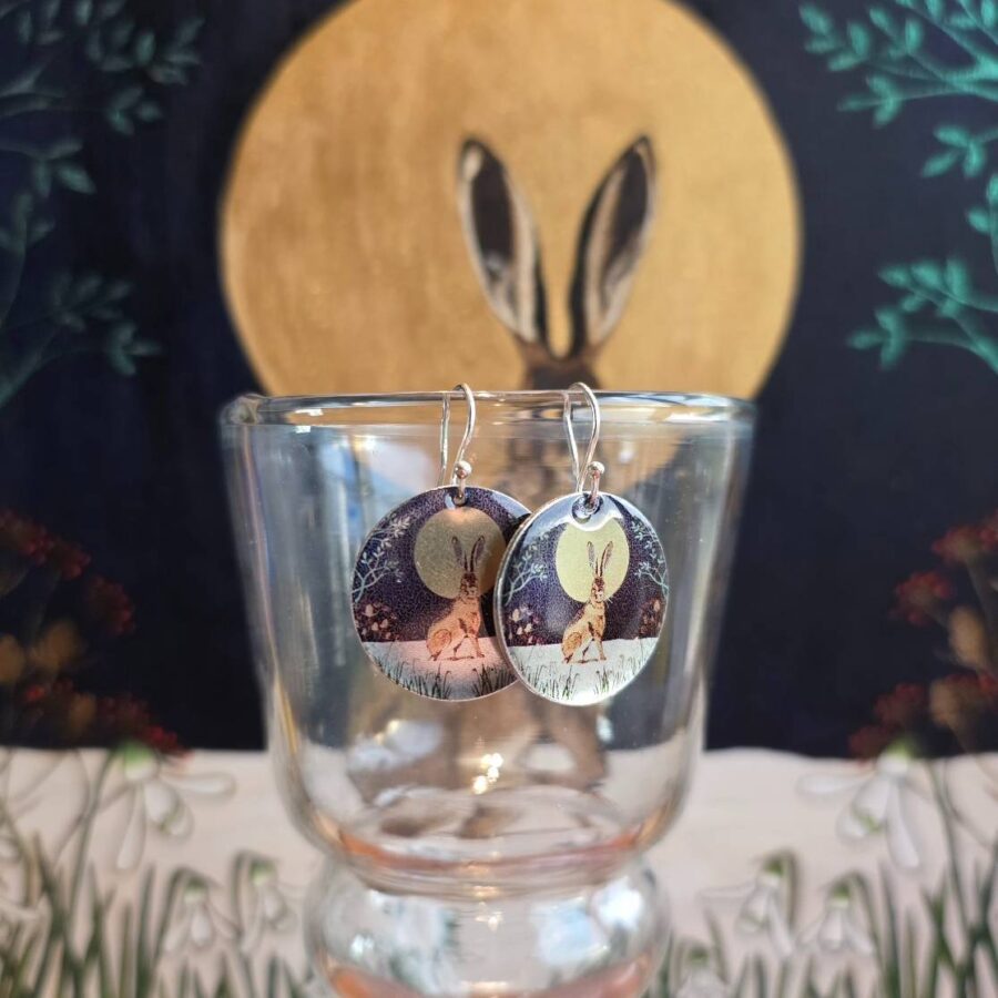 These gorgeous earrings feature "Hare and Snowdrops" artwork by Hannah MacIver. They are made from aluminium discs with sterling silver ear wires. Hannah prints and makes the artwork transfers then slides them onto the aluminium. Once dry they are sealed in a layer of UV resin. Matching cuff bracelet, dinky drop earrings and disc pendant are also available.