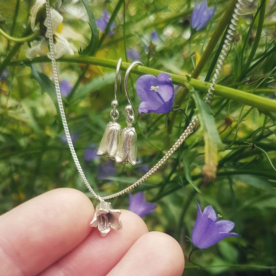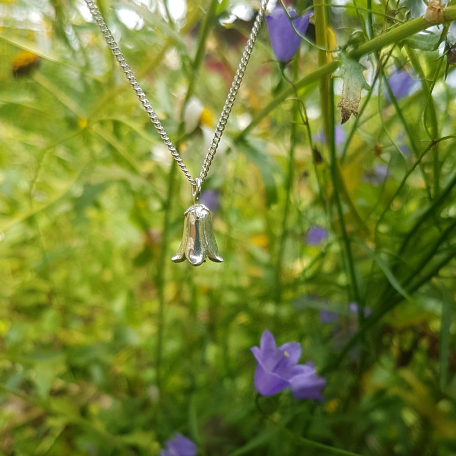 This pretty little necklace has a sterling silver Harebell with tiny moving fine silver stamen in its centre, and hangs from a sterling silver chain. Harebells are known as the Scottish Bluebell. It will come gift boxed.
