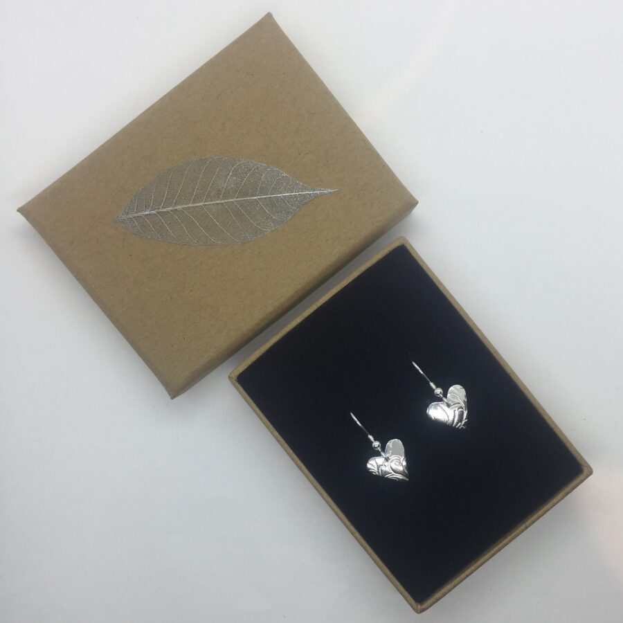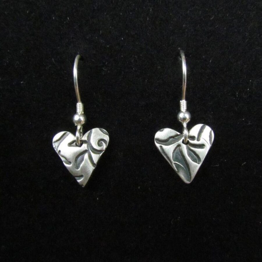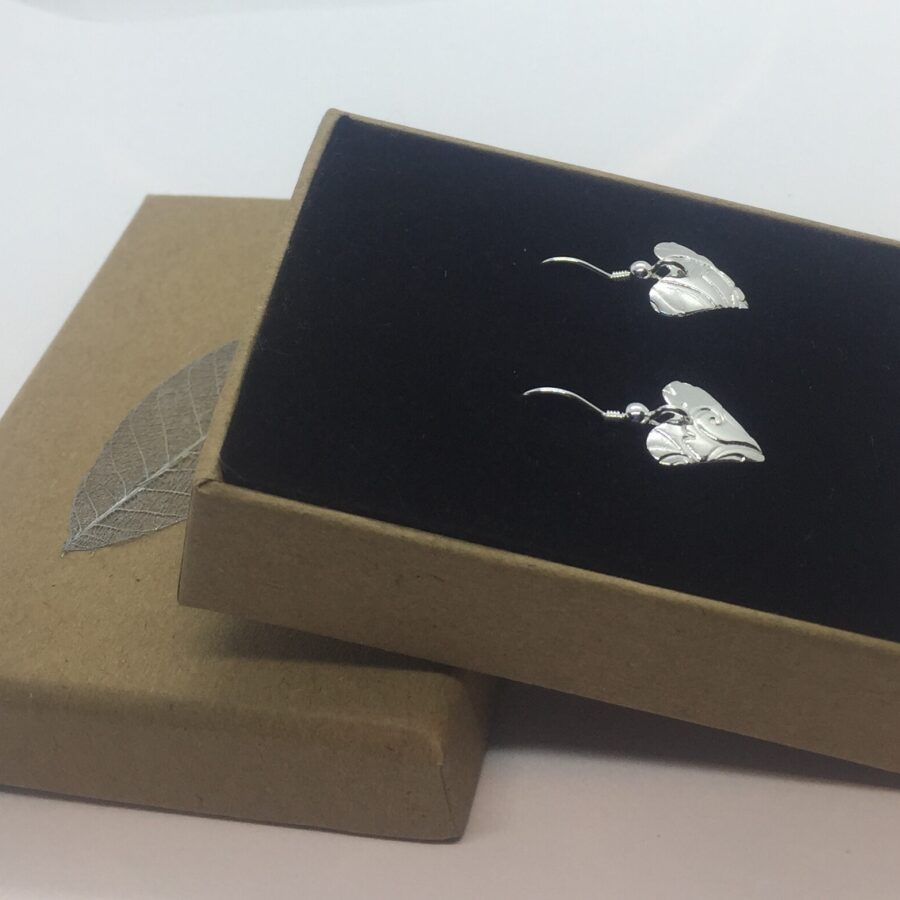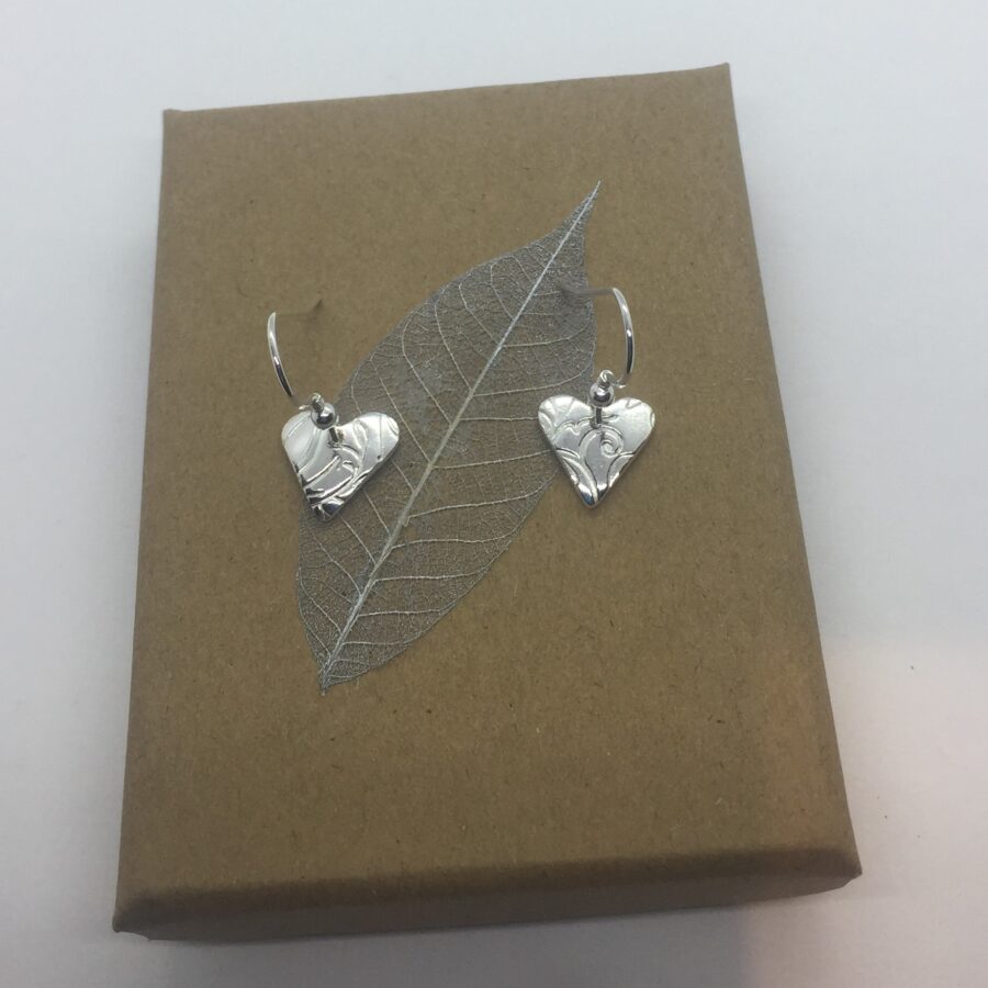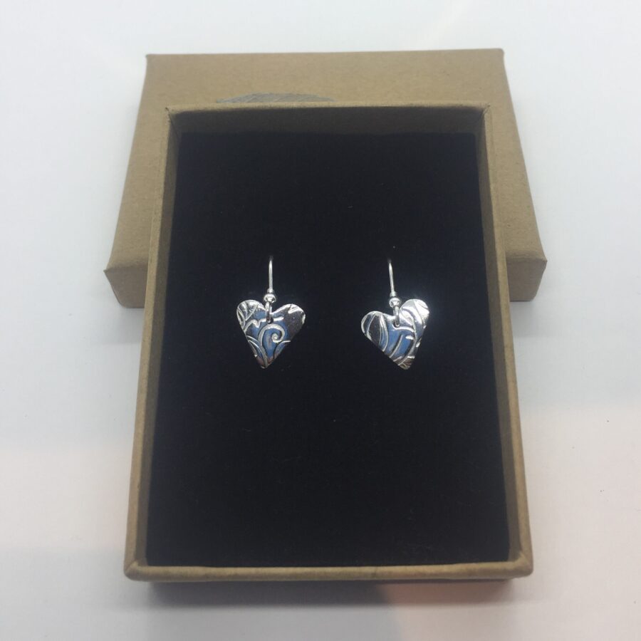 These lovely little silver heart earrings are handcrafted from art silver clay and are 99.9% pure silver. They are slightly curved with a leaf and swirl design. These heart shaped earrings are very cute and are polished to a mirror finish so they really shine! Earring findings are sterling silver. If you would like them oxidised then please request this upon ordering (in the comment box) see the last picture as the example for this oxidised version. If you request them oxidised the leaf and swirls will be blackened to highlight the design.