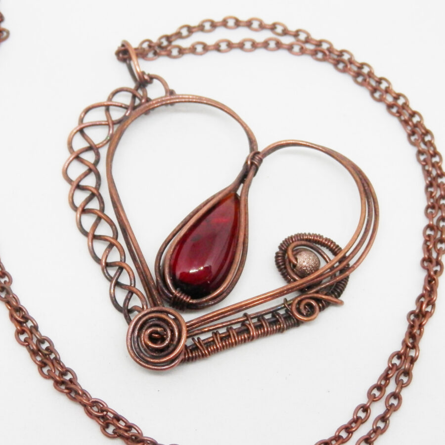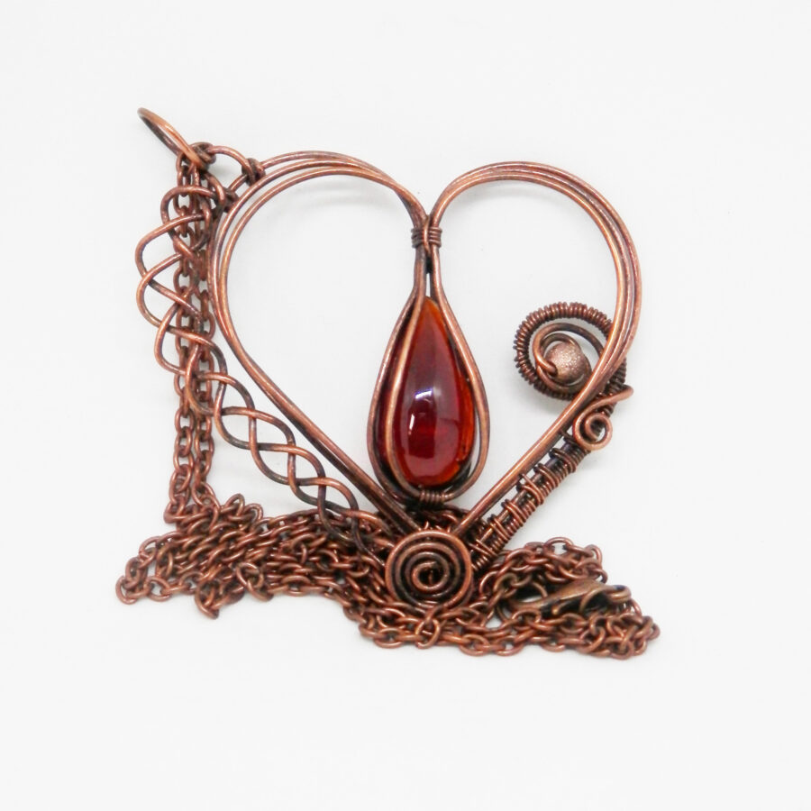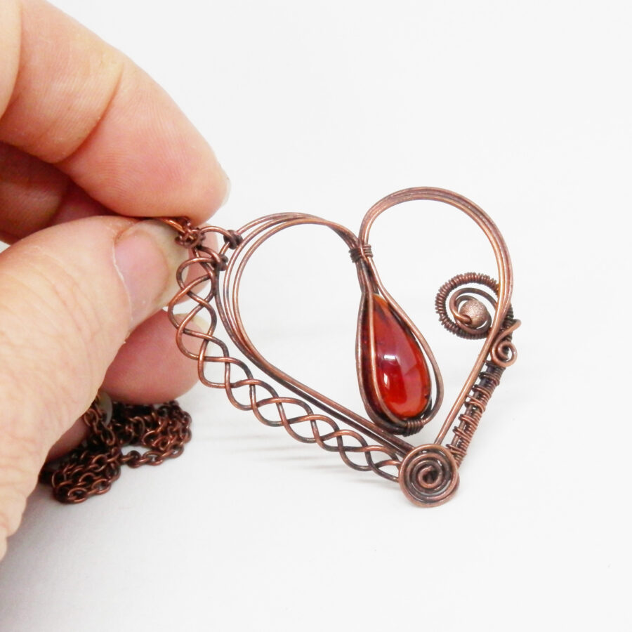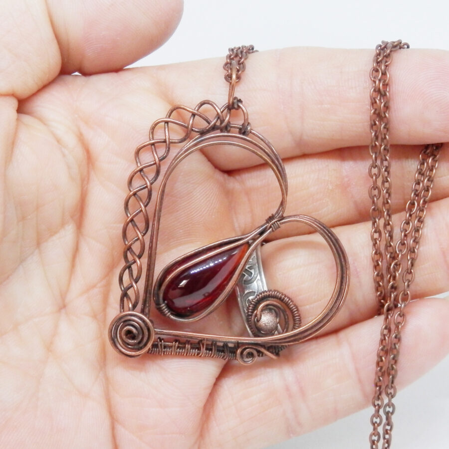 A beautifully hand crafted 'antiqued copper' heart shaped necklace with Celtic braiding and wire wrapping surrounding a gorgeous deep red garnet drop. The pendant is around 5.2 cm long by around 4.5 cm wide and about 0.8 cm thick at the deepest point. It comes with a 24 inch antiqued copper chain with lobster clasp. Lead and nickel free This wire wrapped pendant will come to you placed in a soft velvet pouch.