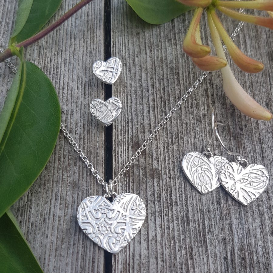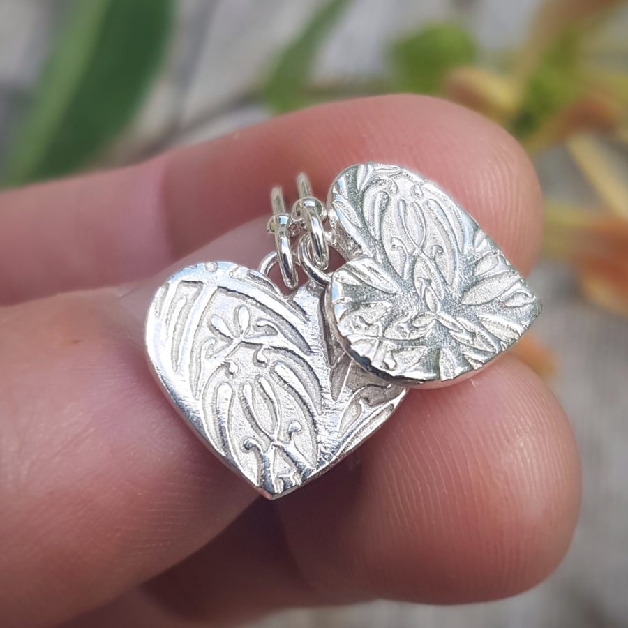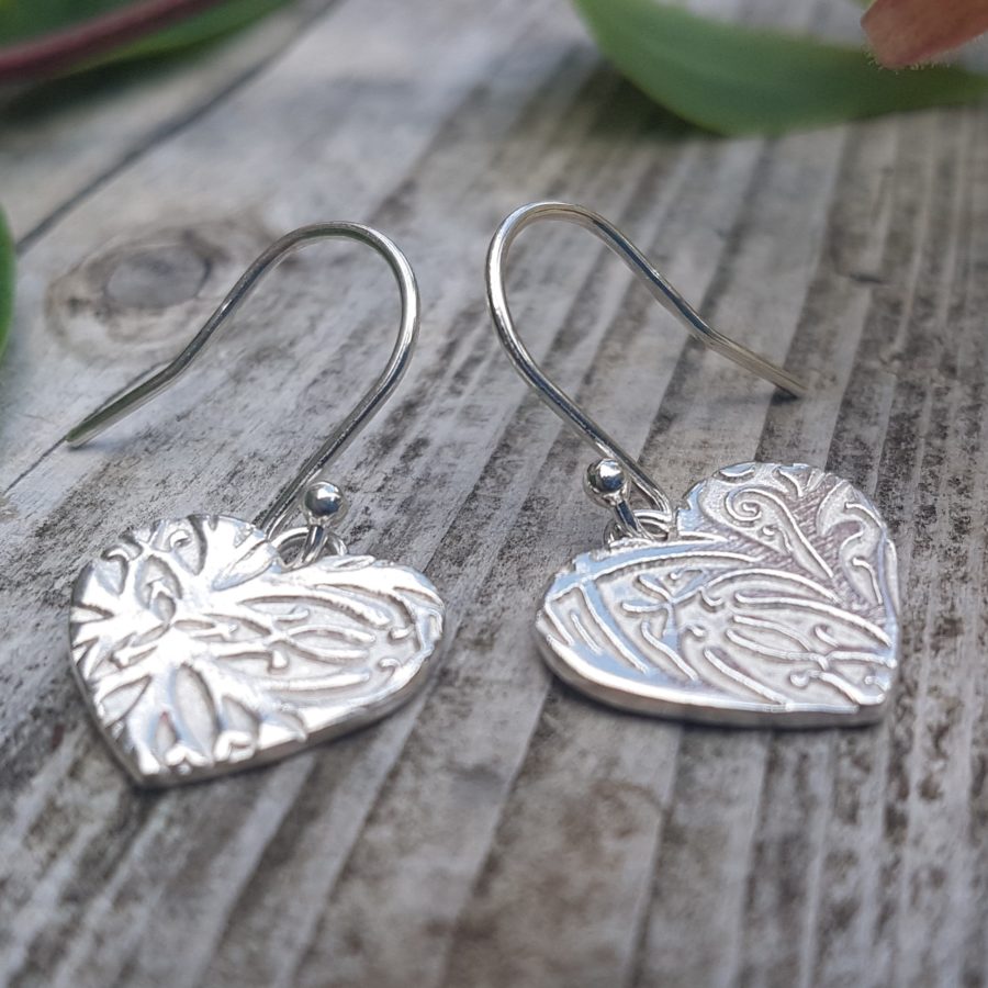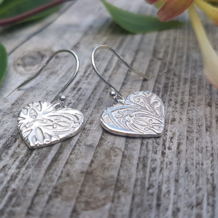 These pretty earrings are made from fine silver hearts that have a deep relief floral design, and hang from sterling silver ear hooks. Due to the handmade nature each heart design is unique. They will come gift boxed.
