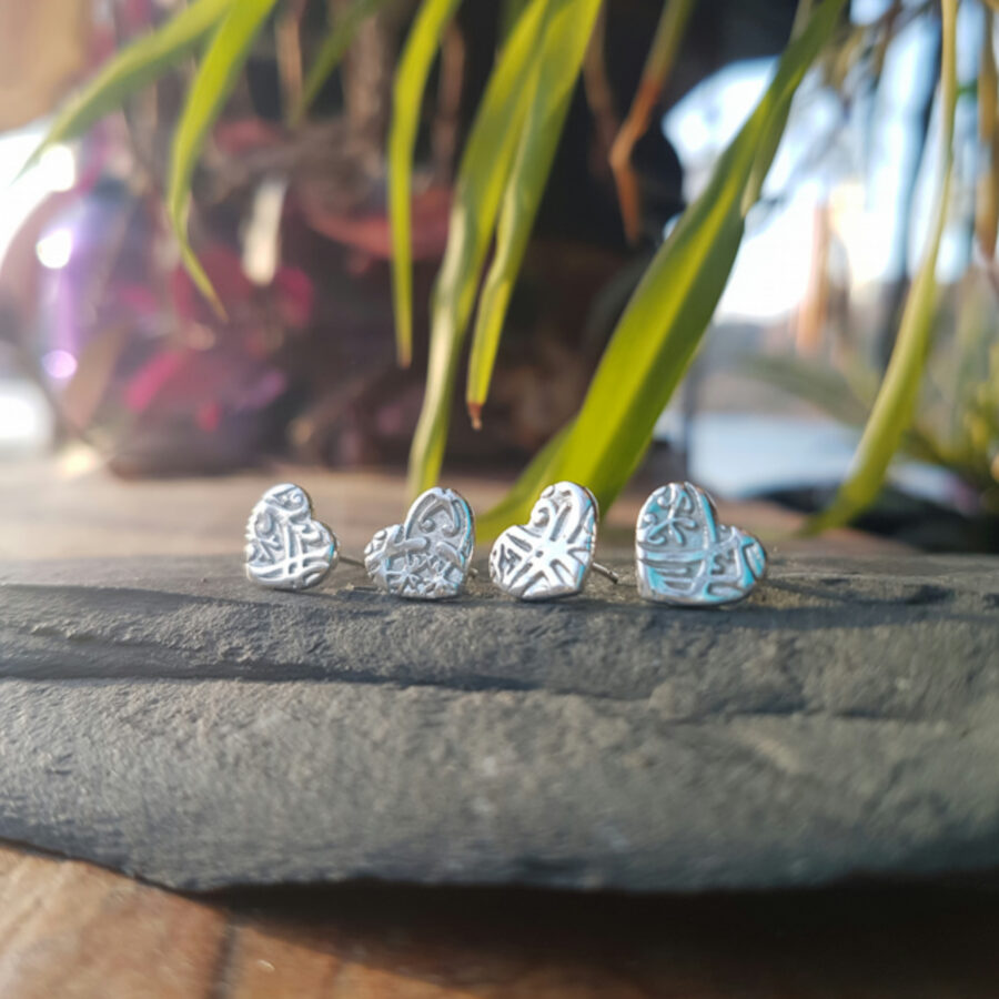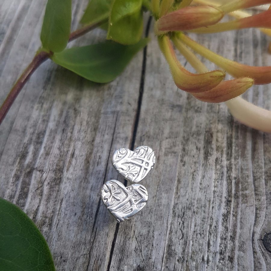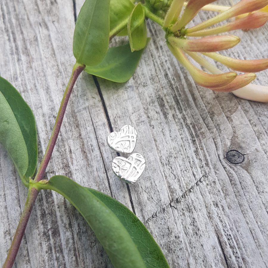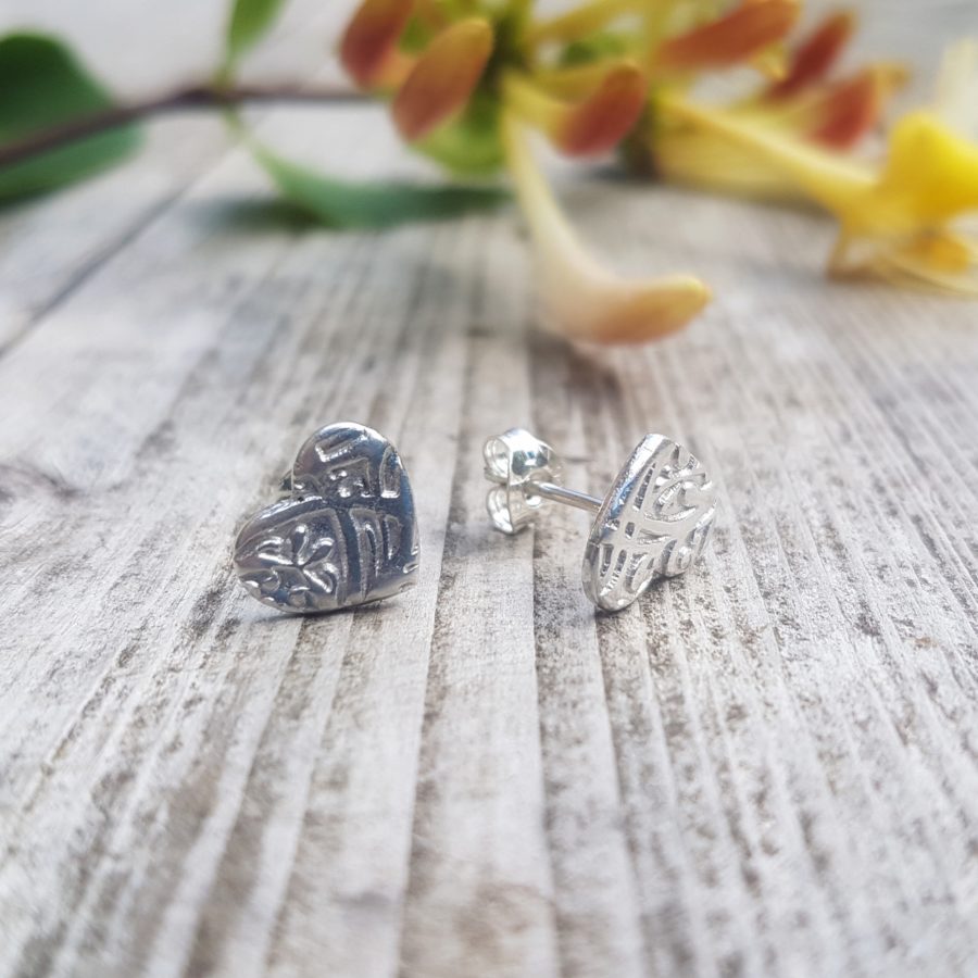 These pretty ear studs are made from fine silver hearts that have a deep relief floral design, the ear posts and scrolls are sterling silver. Due to the handmade nature each heart design is unique. They will come gift boxed.