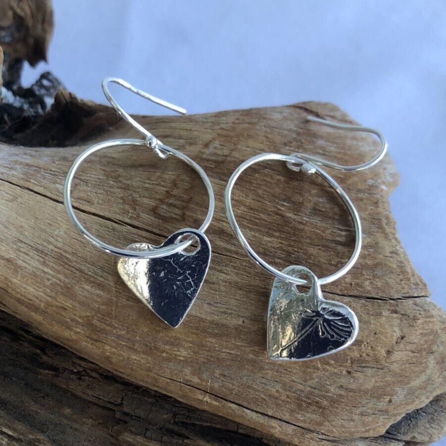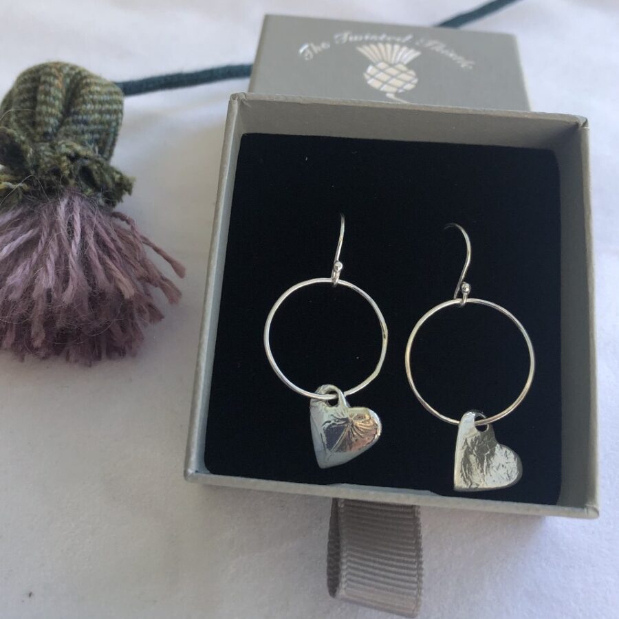These beautiful earrings are hand made and designed by Lorraine of Twisted Thistles. These sterling silver drop earrings feature a wire circle with embossed hearts.
