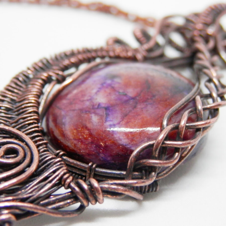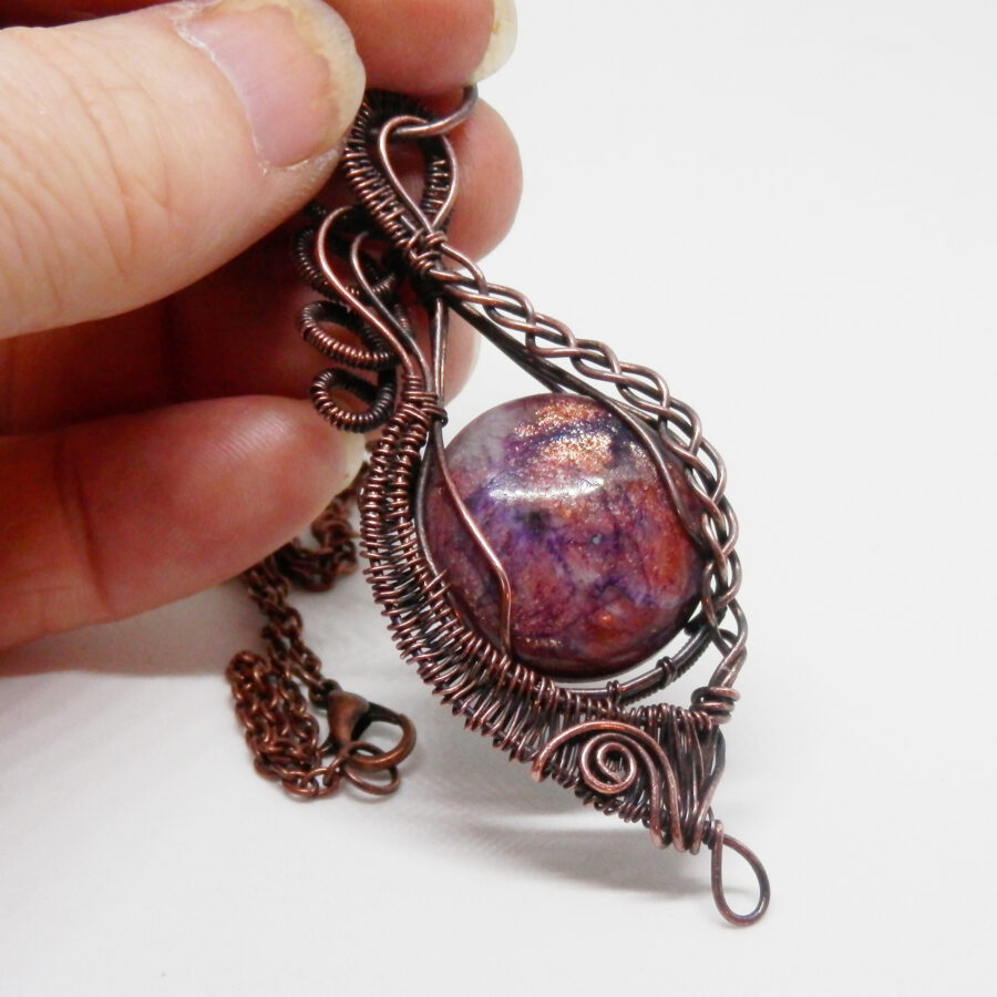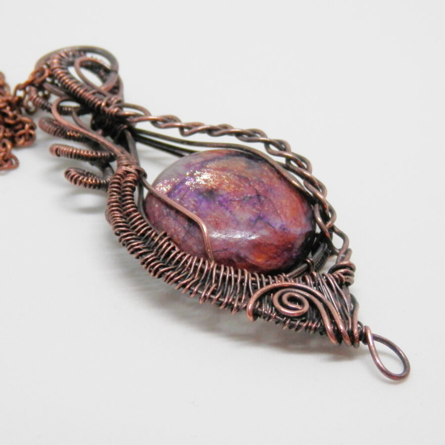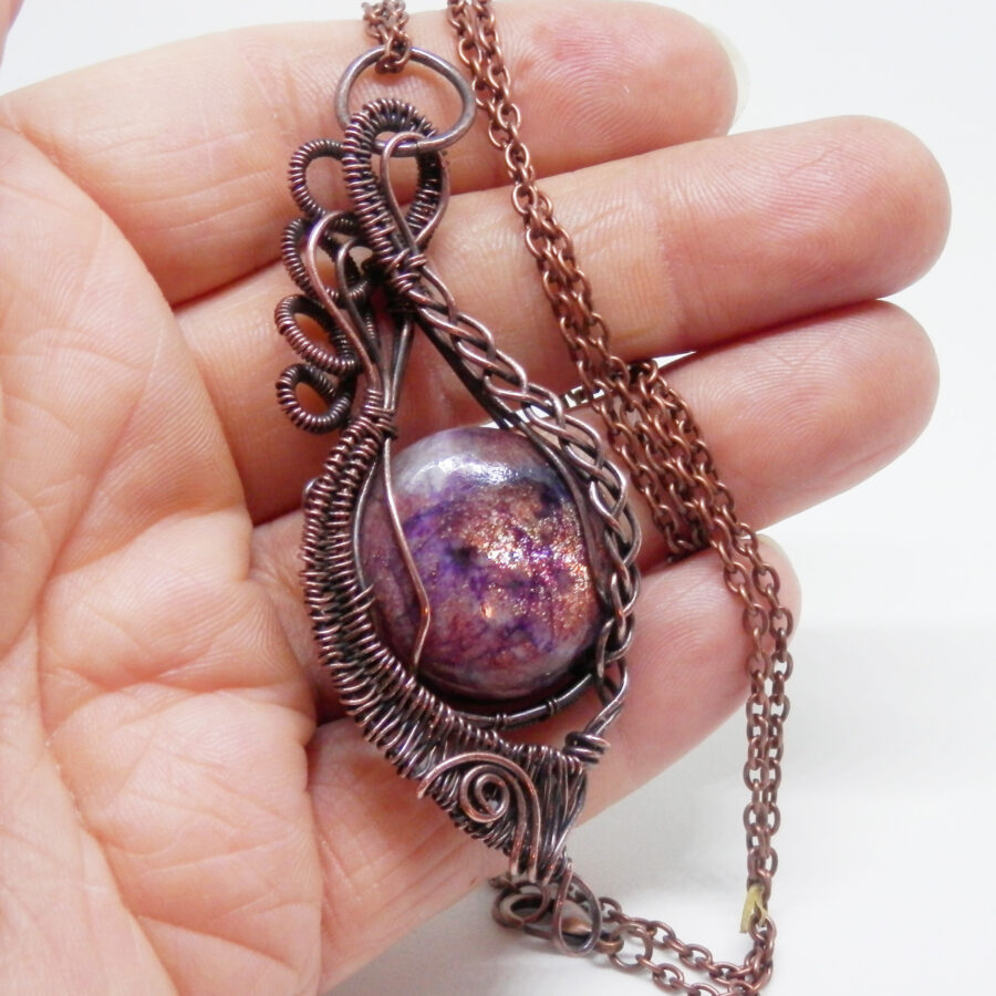 A gorgeous piece of iolite with sunstone has been wrapped in antiqued copper wire using various techniques to create this pendant. The stone is a fabulous shade of purple with streaks of white, deeper purple, and flashes of golden sunstone that sparkles in the light. The pendant comes with a 24 inch copper chain with lobster clasp. Lead and nickel free. Comes in a soft velvet pouch.
