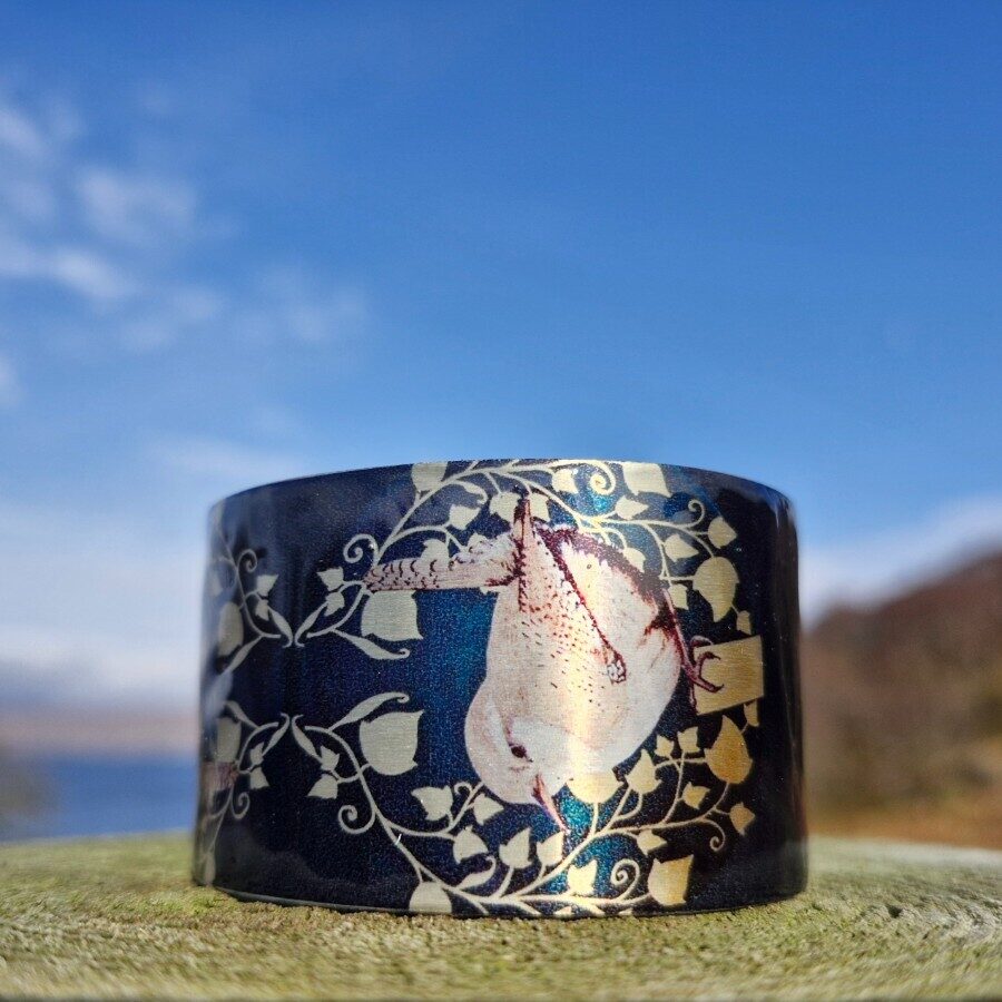 This gorgeous cuff bracelet features "King of the Birds" artwork by Hannah MacIver. It is made from aluminium. Hannah prints and makes the artwork transfers then slides them onto the aluminium she has previously bent into the cuff shape. Once dried she sands the edges and seals them with a coat of UV resin. As these are handmade the finish for each will be slightly differently. Available as narrow or wide cuff, select your preference using the drop down menu.