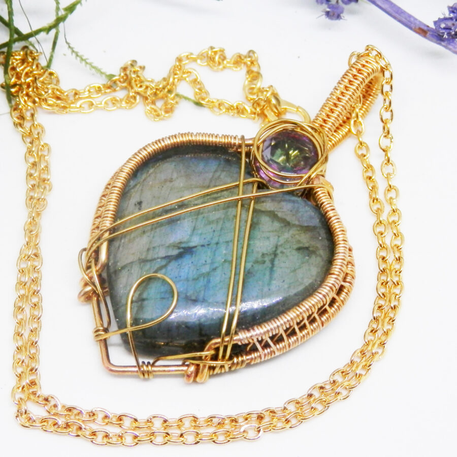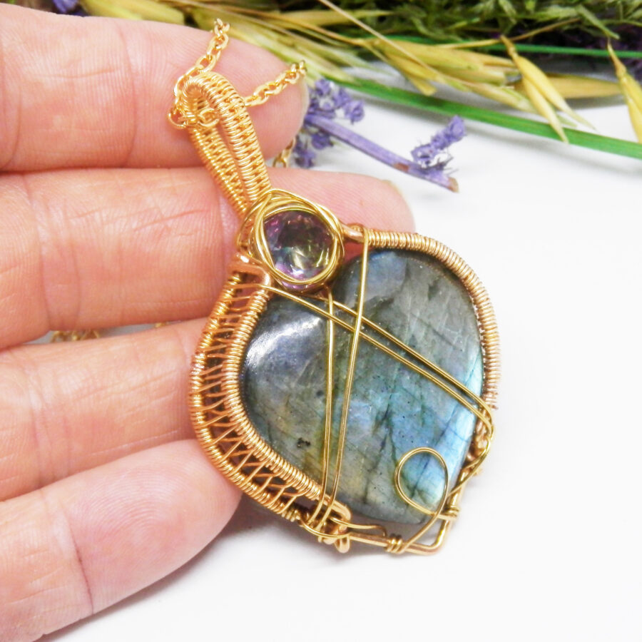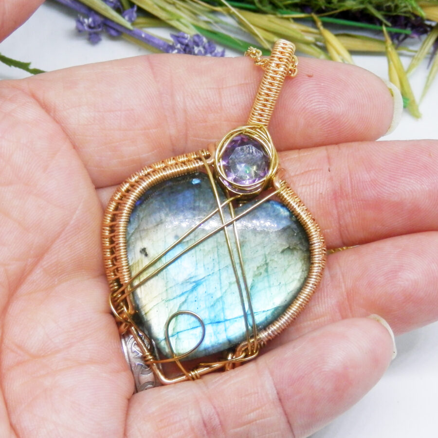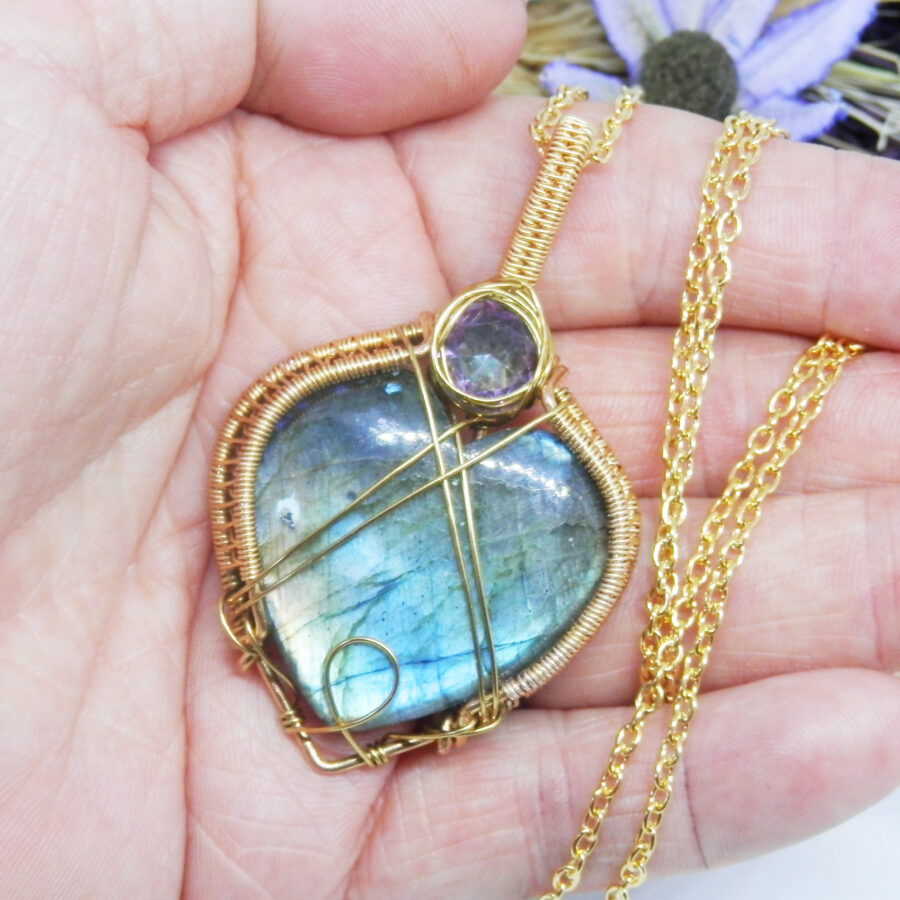 This is a stunning elven style wire wrapped necklace, made with gold plated wire wrapped around a beautiful heart shaped labradorite cabochon. There is a fabulous faceted purple crystal focal stone and plenty of weaving! Comes with a 24 inch gold plated chain with lobster clasp. Lead and nickel free. This wire wrapped pendant will come to you placed in a soft velvet pouch.