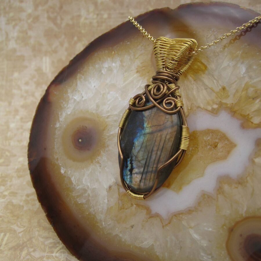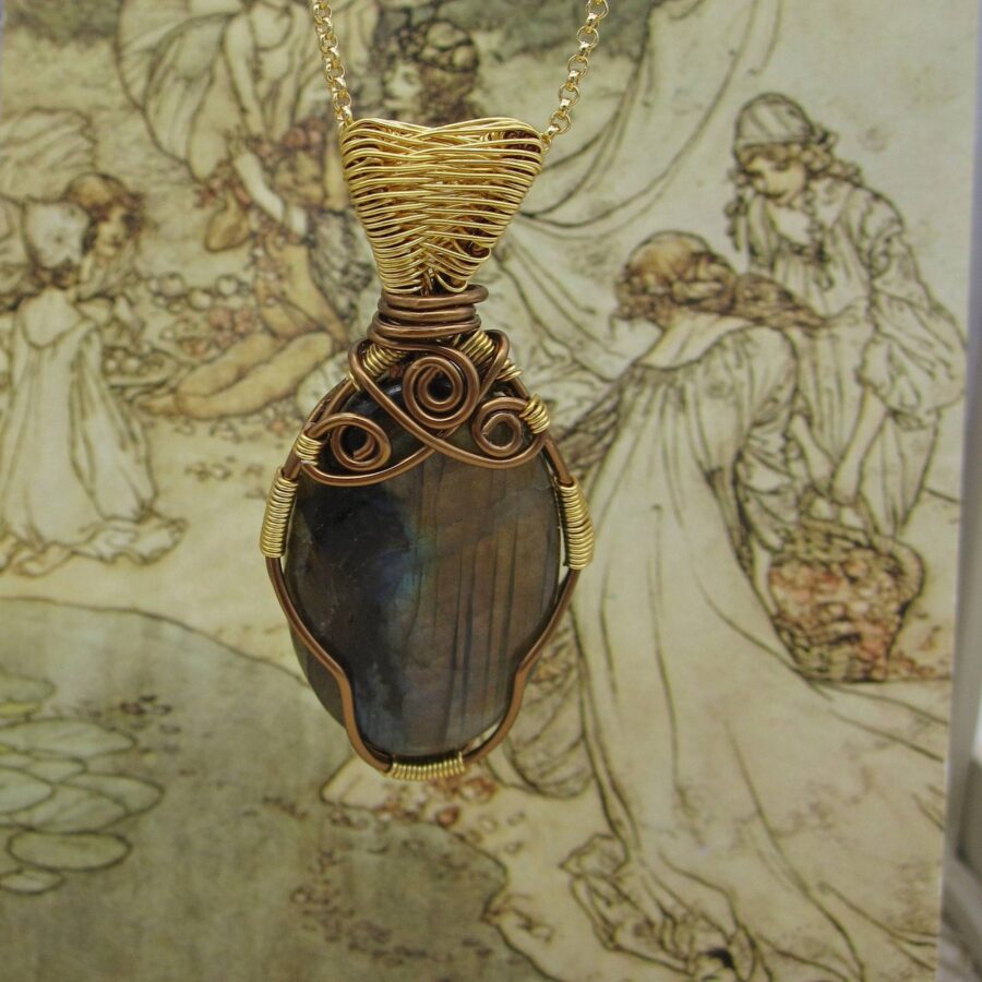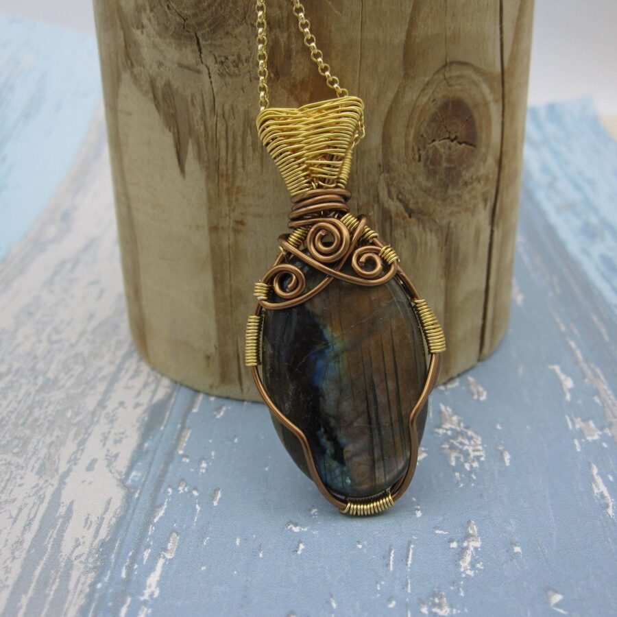 A stunning statement pendant featuring the gemstone labradorite. Inspired by the sight of the Northern Lights from the maker’s home in the Isle of Skye, it features contrasting antique bronze and gold-plated wire wrapping that frames the gemstone – letting it do the talking!