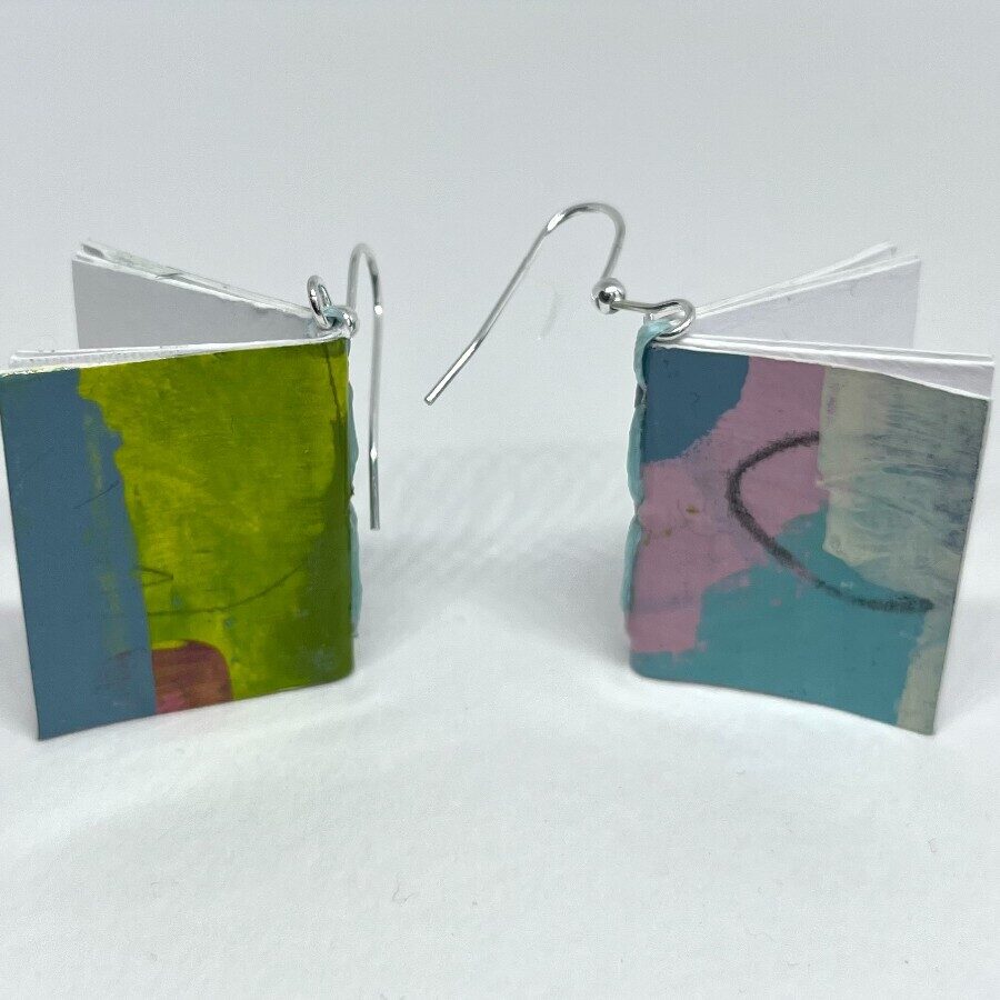 A unique gift for book lovers. These lightweight earrings are crafted from upcycled book pages and hand painted papers. The earrings are finished with sterling silver hook wires for comfort and durability (nickel free & hypoallergenic). The handpainted covers are sealed for strength and durability