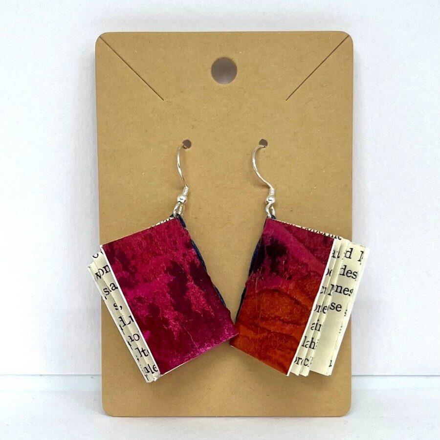 A unique gift for book lovers. These lightweight earrings are crafted from upcycled book pages and hand painted papers. The earrings are finished with sterling silver hook wires for comfort and durability (nickel free & hypoallergenic). The handpainted covers are sealed for strength and durability
