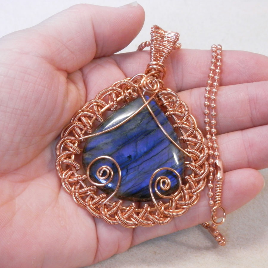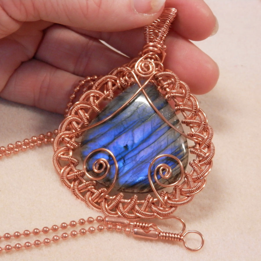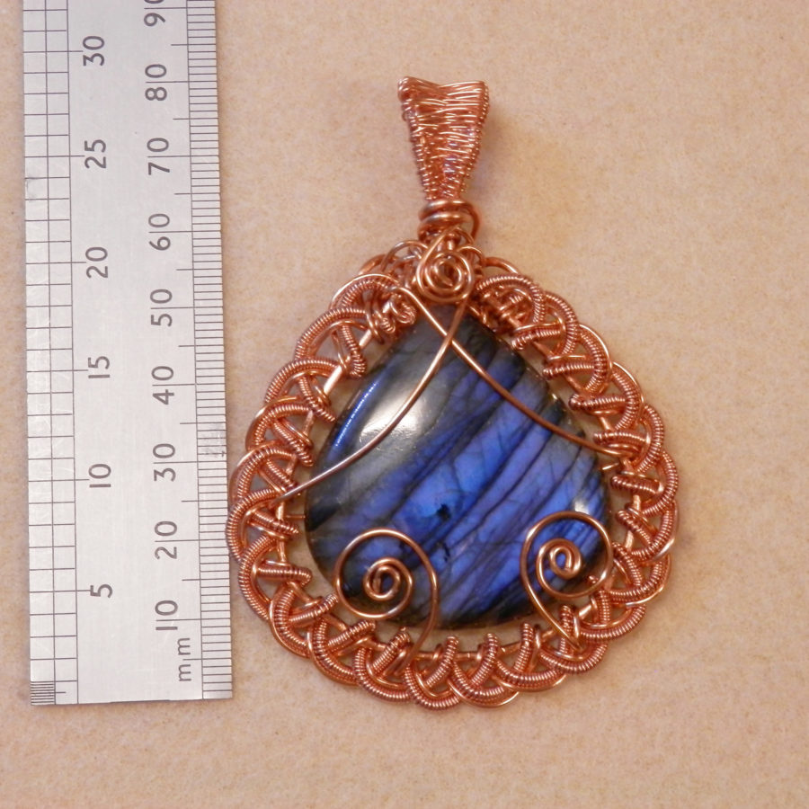 This is a beautiful large labradorite gemstone is wrapped in tarnish resistant copper wire to make into a pendant. The stone is a gorgeous translucent blue-grey colour, with blue flashes and thin streaks of black. The pendant itself is around 8 cm long by 5.8 cm wide and 1.3 cm thick at the deepest point.
