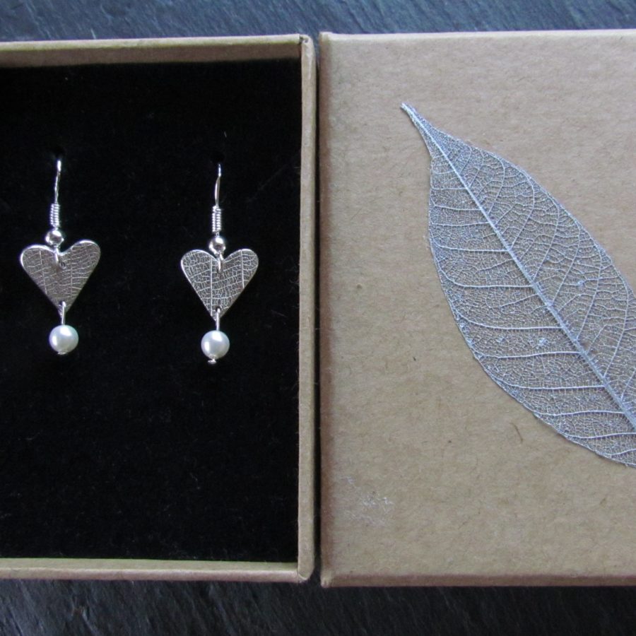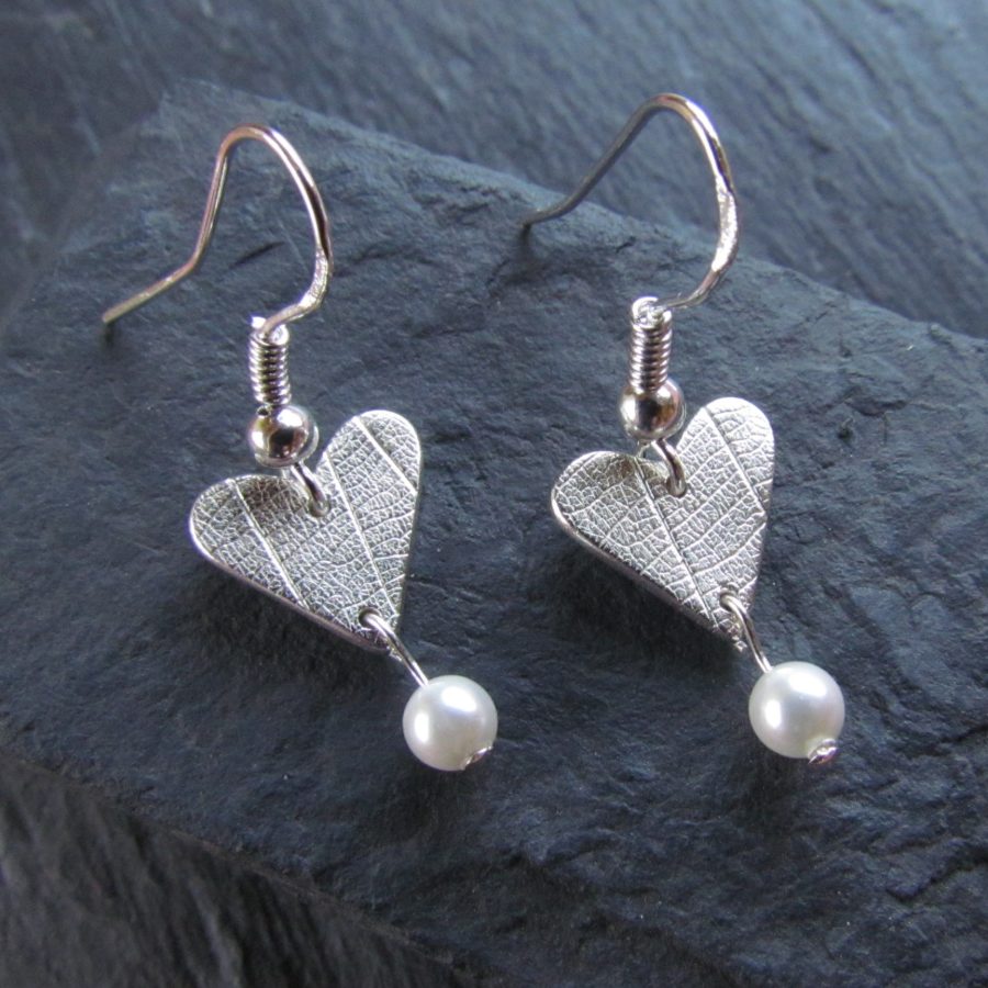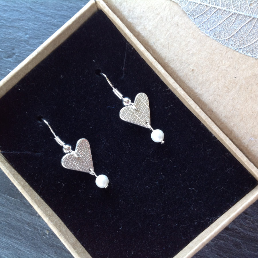 These gorgeous little silver hearts have delicate fine leaf vein detail. These cute hearts are set off nicely by the white pearl drops which really complement the silver. The delicate leaf print on these hearts is subtle but connects the wearer to nature. These really are everyday earrings which will lift your mood as soon as you put them on. These lovely drop earrings are approximately 20mm long and hang beautifully with a small pearl drop.