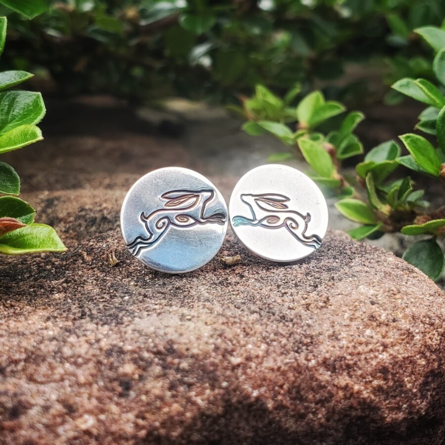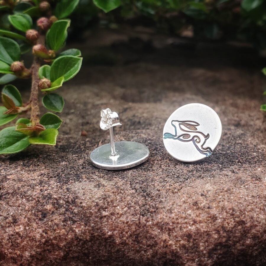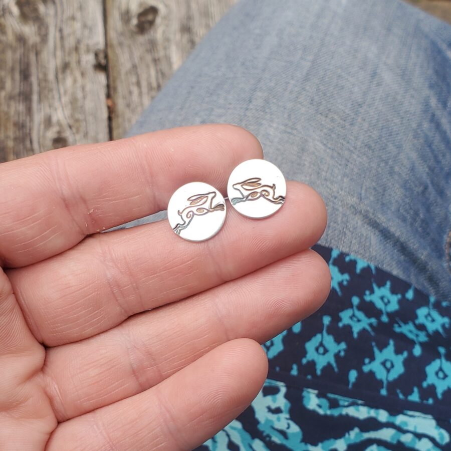 These sterling silver stud earrings are hand stamped with a leaping hare, and given a patina to highlight the design. They have sterling silver posts and scrolls and will come gift boxed.
