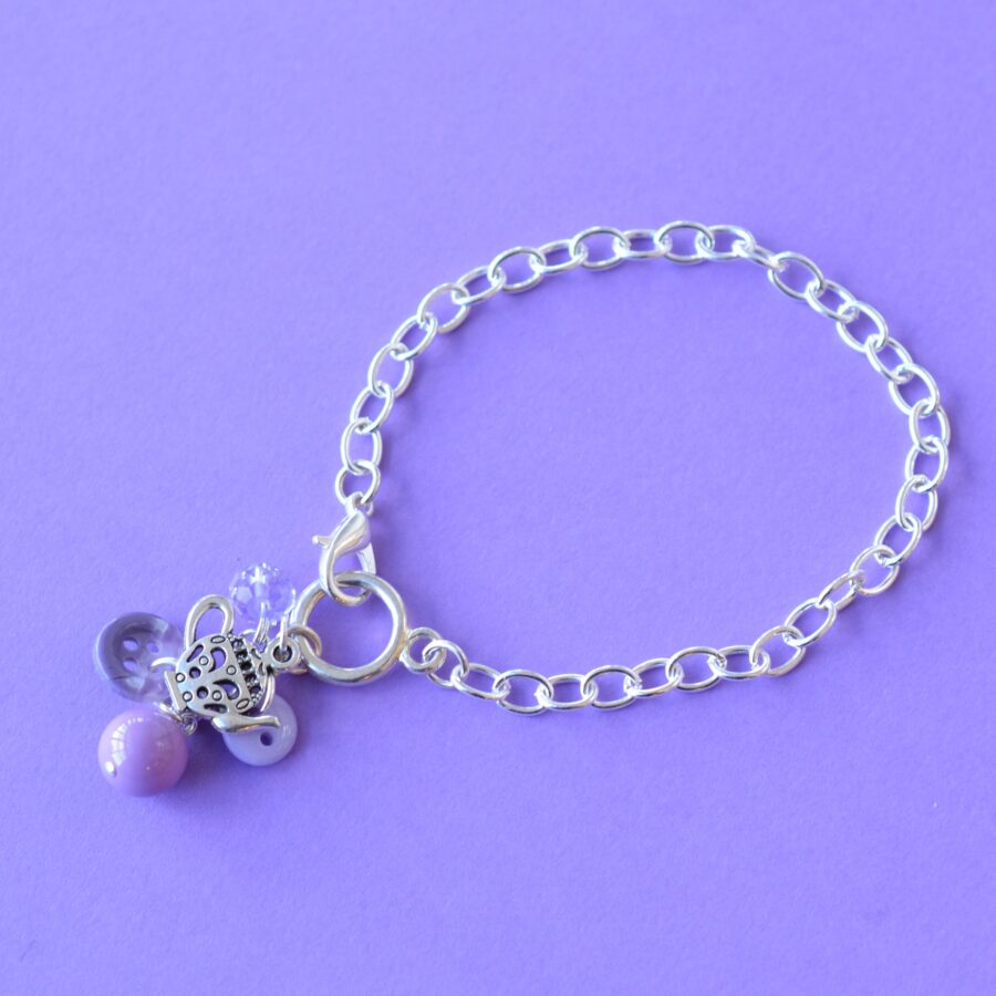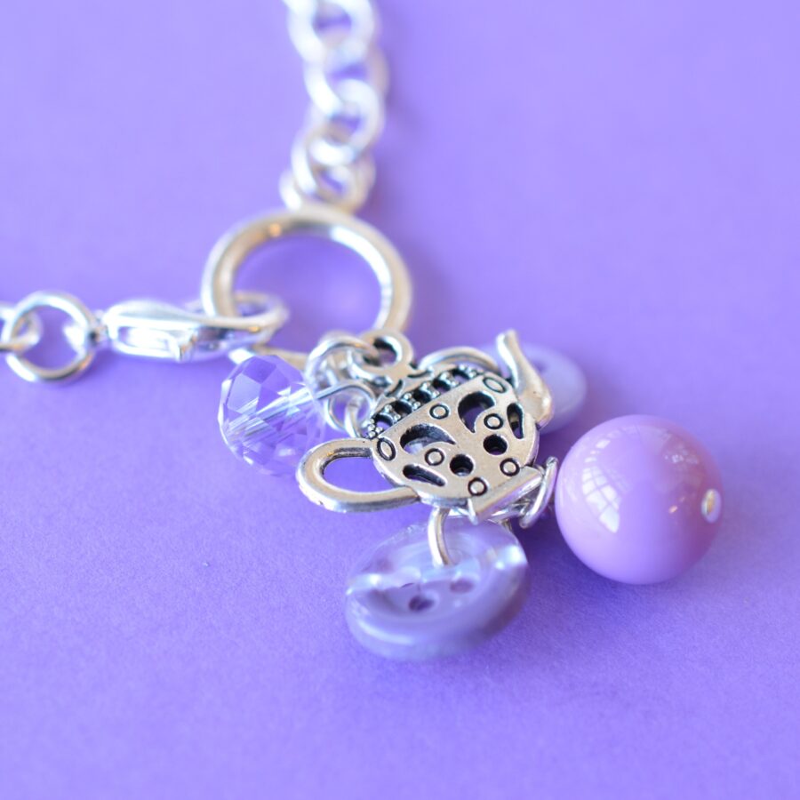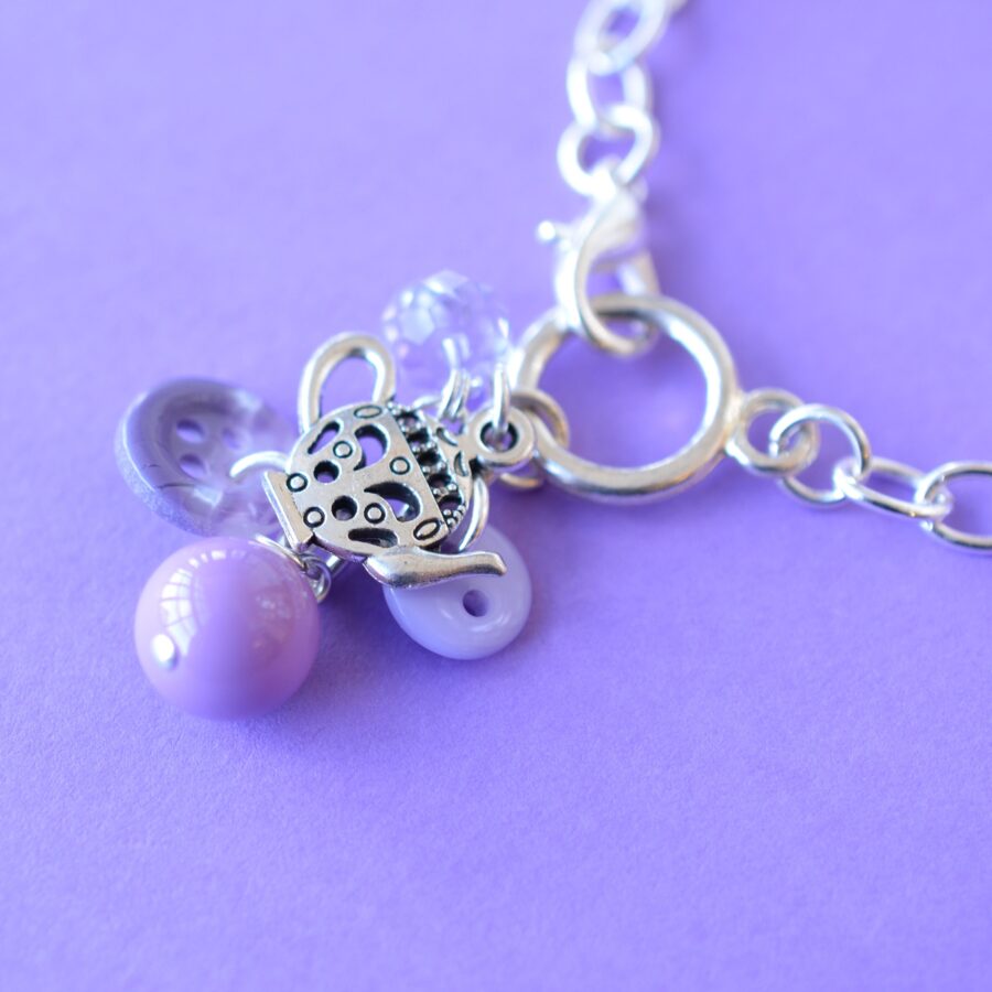 Cluster of buttons, teapot and heart charms, and beads dangling at the end of a silver plated bracelet chain with a large lobster clasp. Bracelet can be joined at various points to fit most wrists, 20 cm at longest. Cluster approx. 3cm long. Made with silver-plated findings.