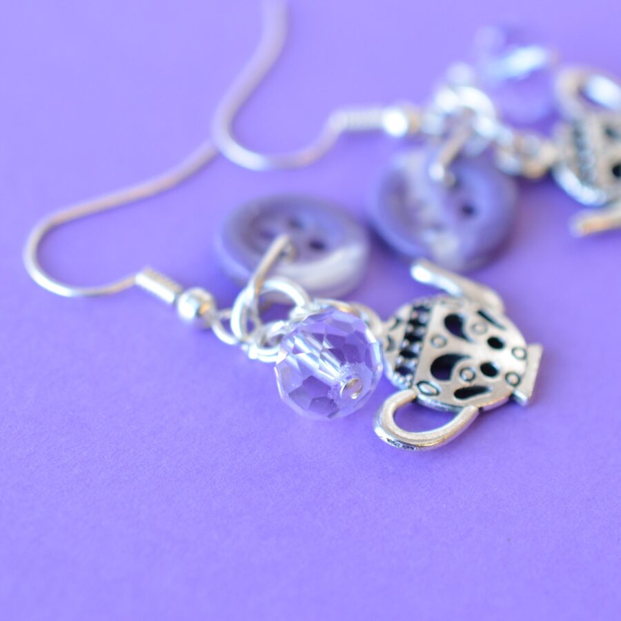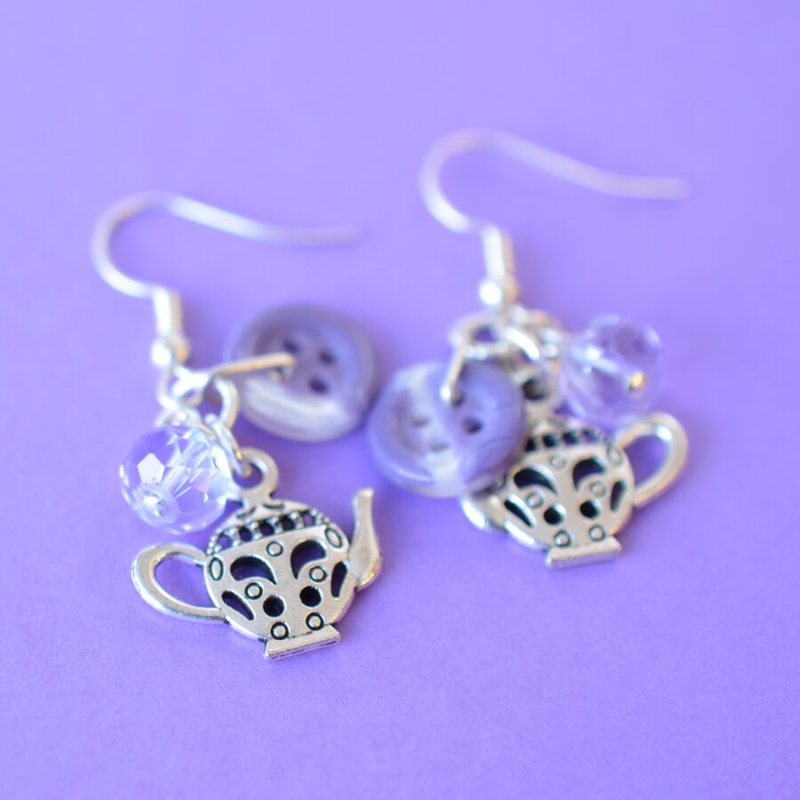 Cluster made of a button a bead and a teapot charm. Ear findings are sterling silver, other findings are silver-plated. Full length of earring from top of the hook is approx. 4 cm. Supplied in a gift pouch.
