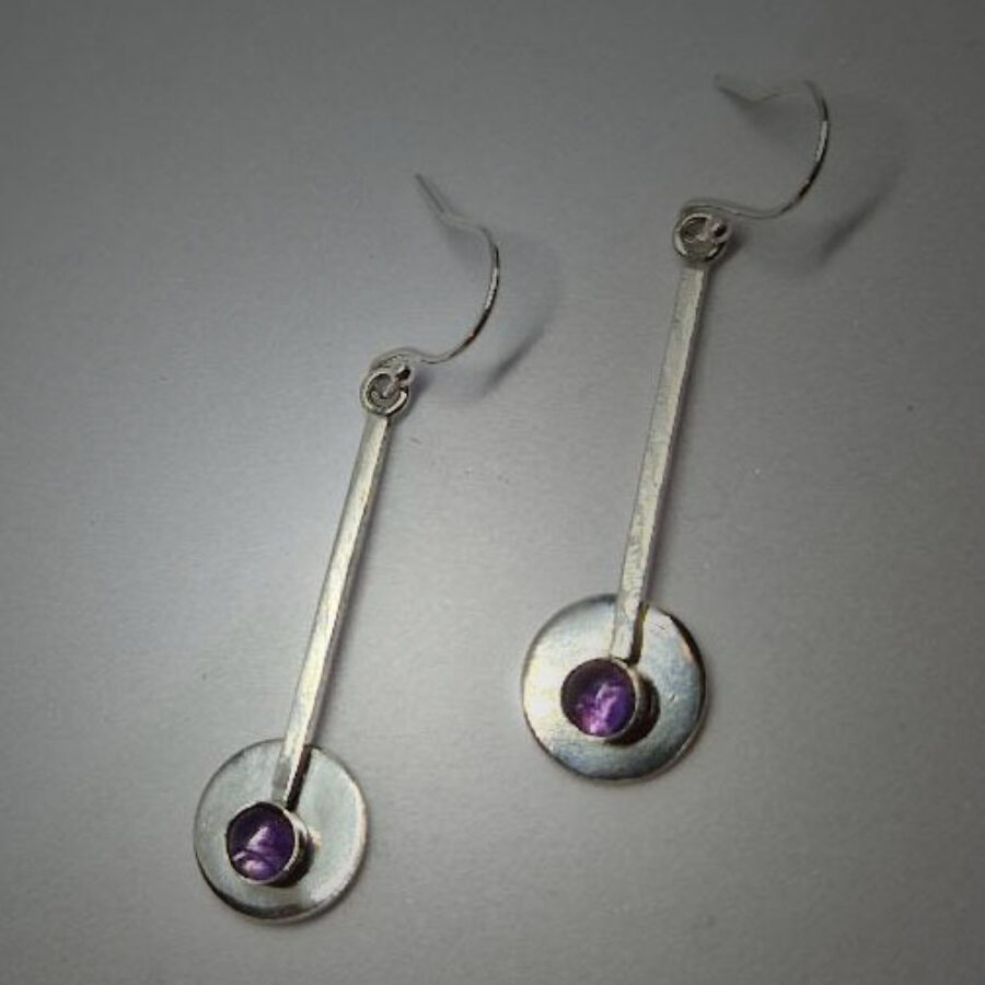 A pretty pair of earrings featuring an amethyst set in silver circle on long silver drop. All items are gift boxed with recyclable packaging.