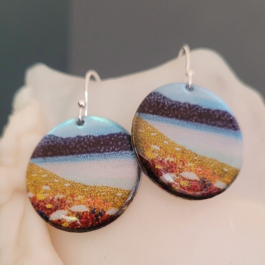 These gorgeous earrings feature "Machair" artwork by Hannah MacIver. They are made from aluminium discs with sterling silver ear wires. Hannah prints and makes the artwork transfers then slides them onto the aluminium. Once dry they are sealed in a layer of UV resin.