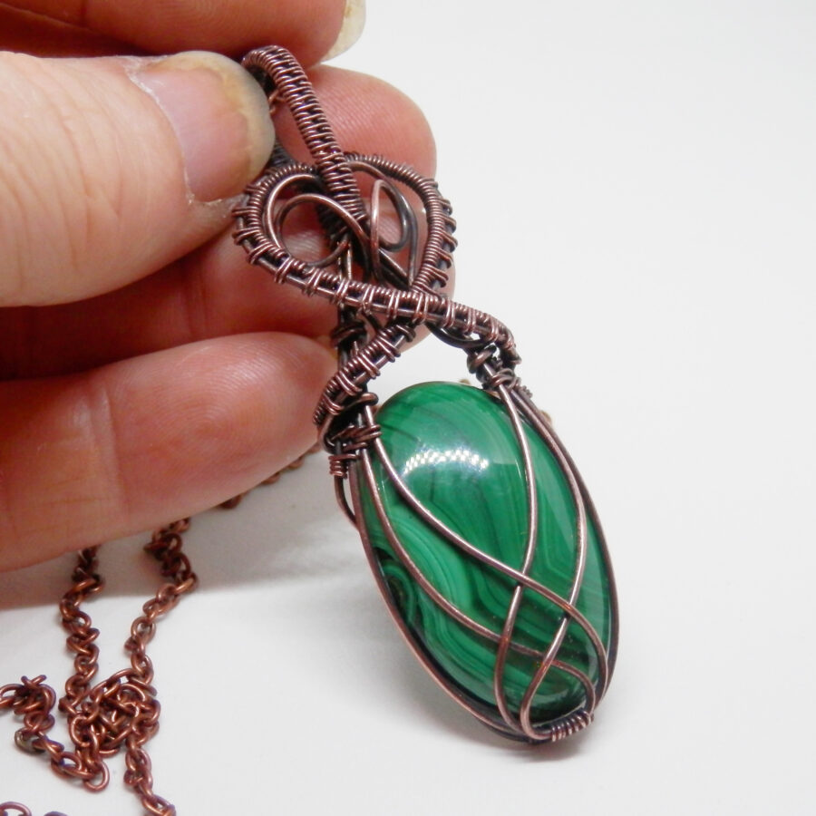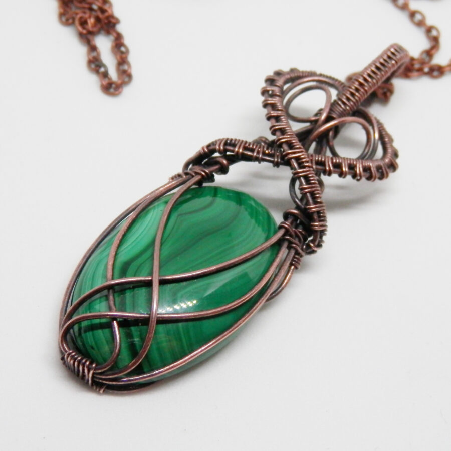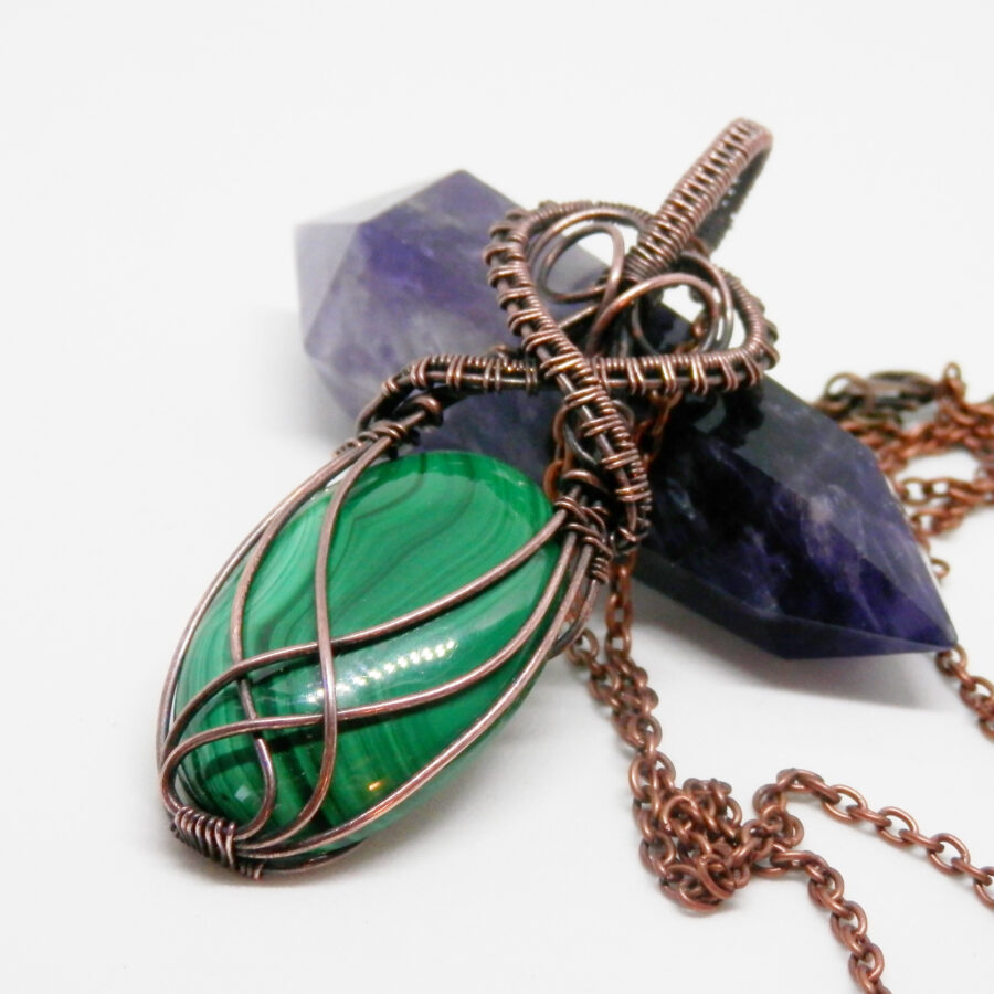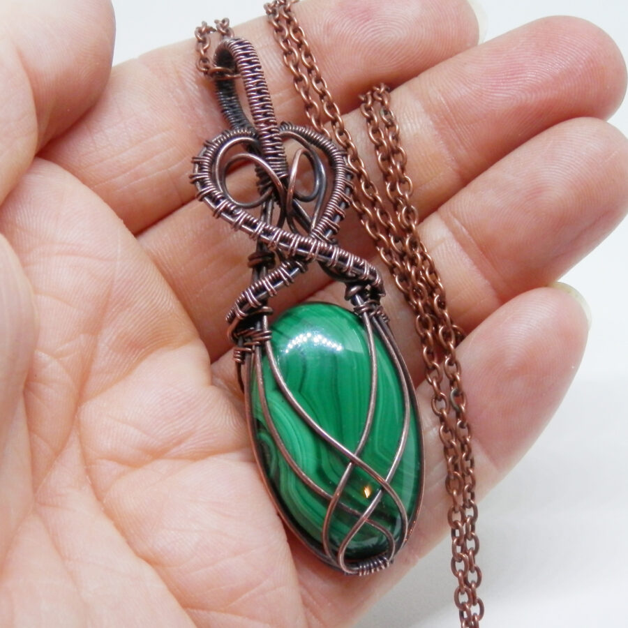 A beautiful piece of malachite has been wrapped in antiqued copper wire using a simple but flattering ‘Celtic’ design to make into a pendant. The stone is a gorgeous shade of green with gentle swirls and stripes in various green shades. The pendant comes with a 24 inch copper chain with lobster clasp. Lead and nickel free. Comes in a soft velvet pouch.
