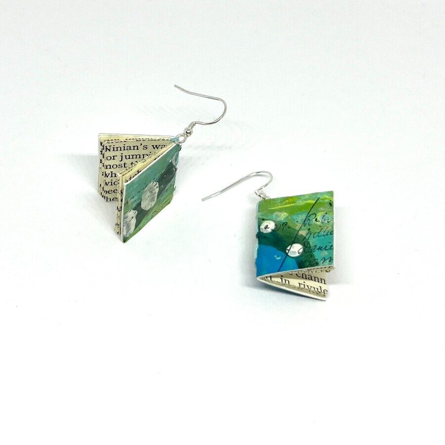 A unique gift for book lovers. These lightweight earrings are crafted from upcycled book pages and hand painted papers. The earrings are finished with sterling silver hook wires for comfort and durability (nickel free & hypoallergenic). The handpainted covers are sealed for strength and durability