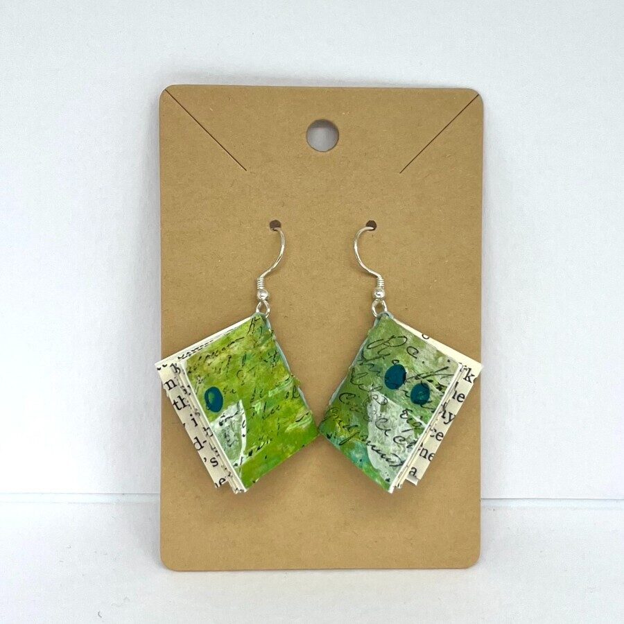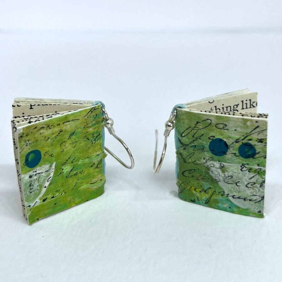 A unique gift for book lovers. These lightweight earrings are crafted from upcycled book pages and hand painted papers. The earrings are finished with sterling silver hook wires for comfort and durability (nickel free & hypoallergenic). The handpainted covers are sealed for strength and durability