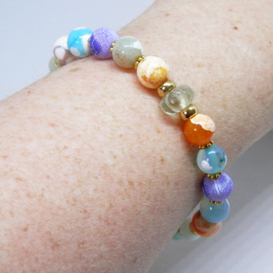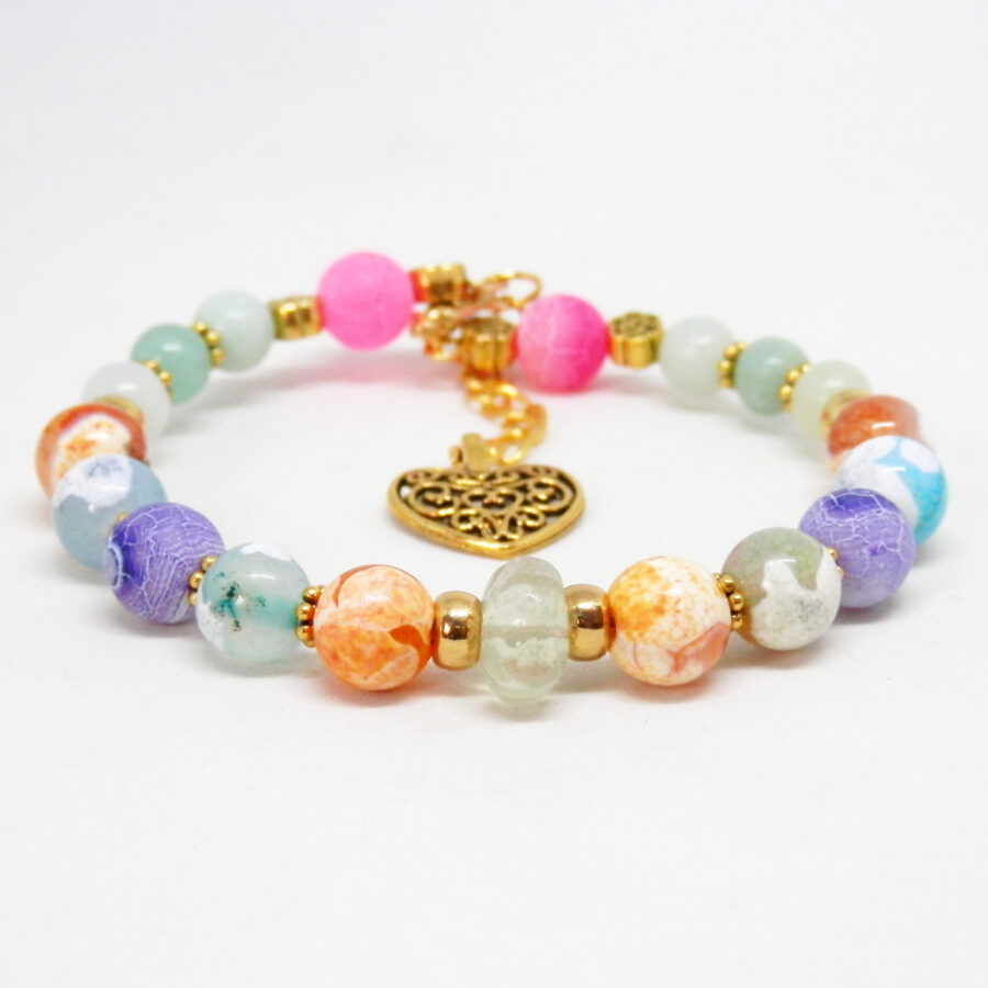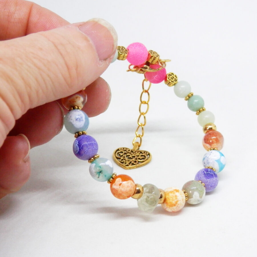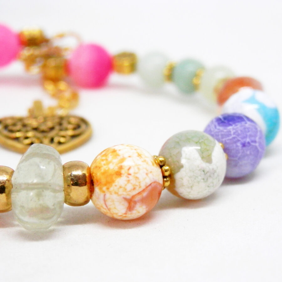 A gorgeous handmade memory wire bracelet made with beautiful agate beads in lots of summery colours. With gold plated spacer beads and metallic Celtic patterned beads, and a lovely Filigree heart charm. Would fit a 7 inch wrist, but comes with an extension chain for the larger wrist. Lead and nickel free This bracelet will come to you placed in an organza bag.