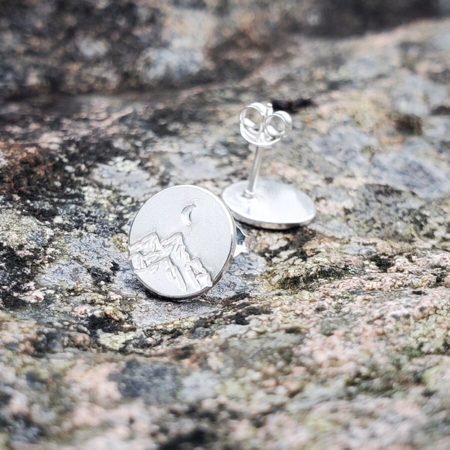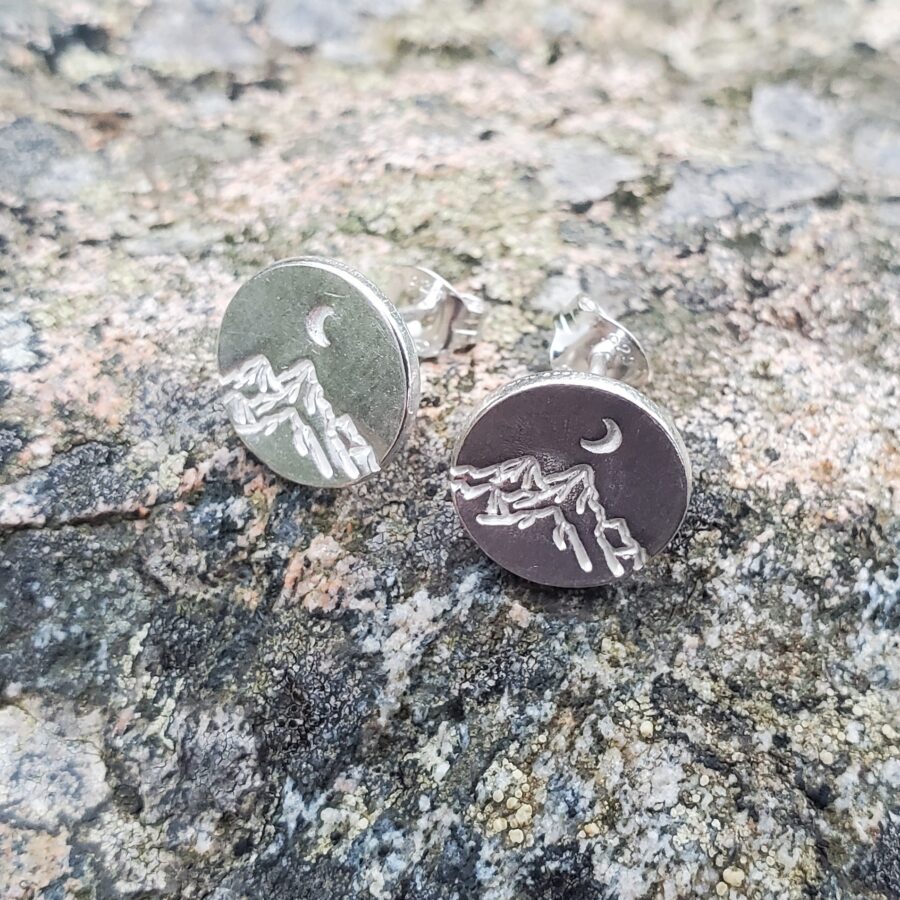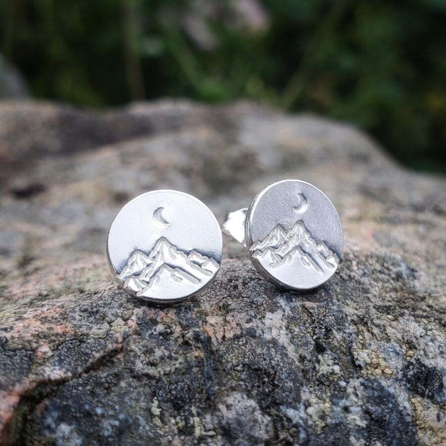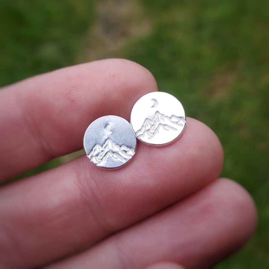 These gorgeous mountain studs are all sterling silver, including the posts and scrolls. They have a crescent moon shining down on the mountain range. They will come gift boxed.