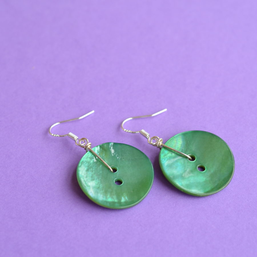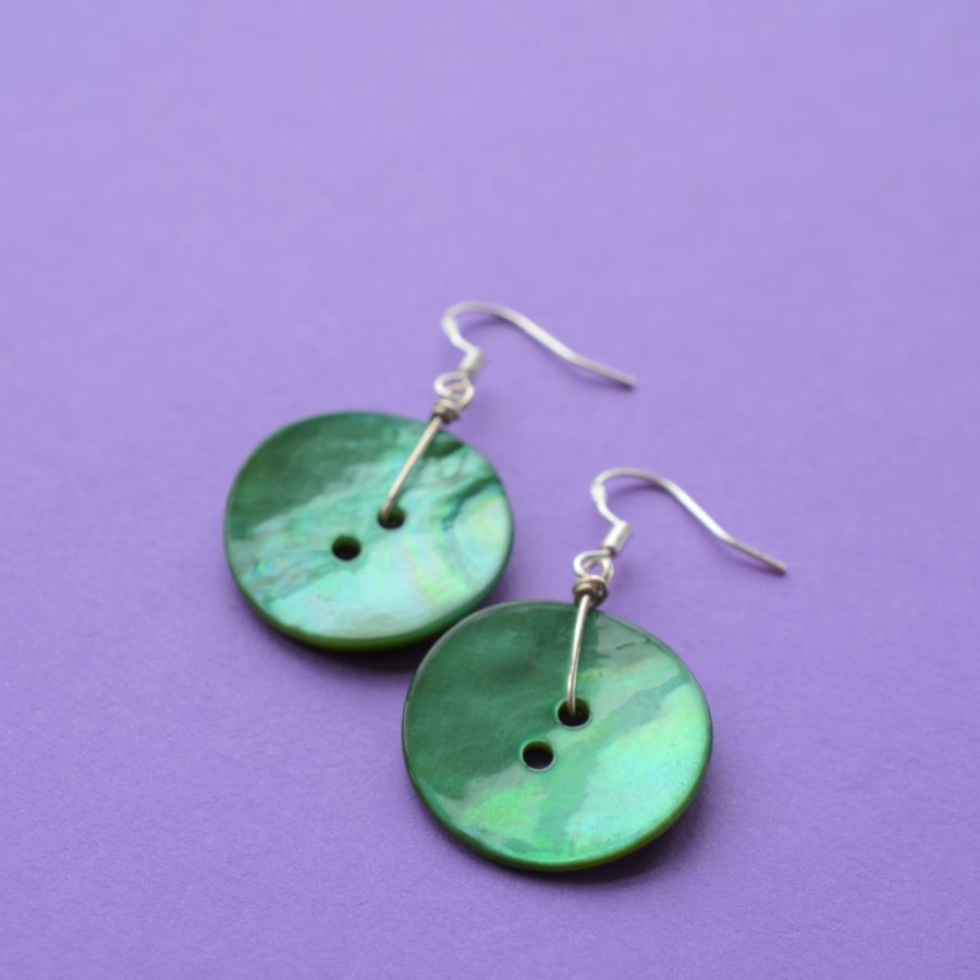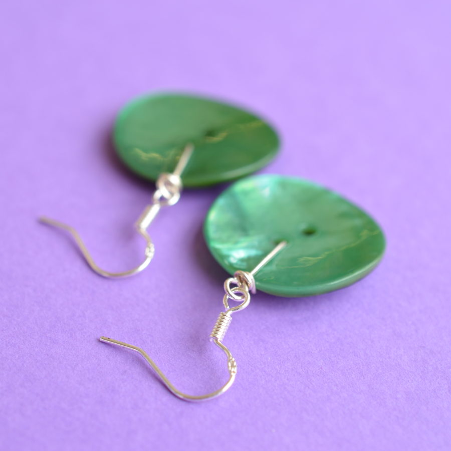 A pair of large matching focal real mother of pearl buttons dyed a beautiful turquoise colour. Ear findings are sterling silver, other findings are silver-plated. Buttons approx. 23mm across. Full length of earring from top of the hook is approx. 4.5 cm. Supplied in a gift pouch.