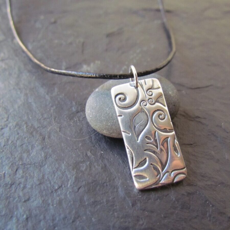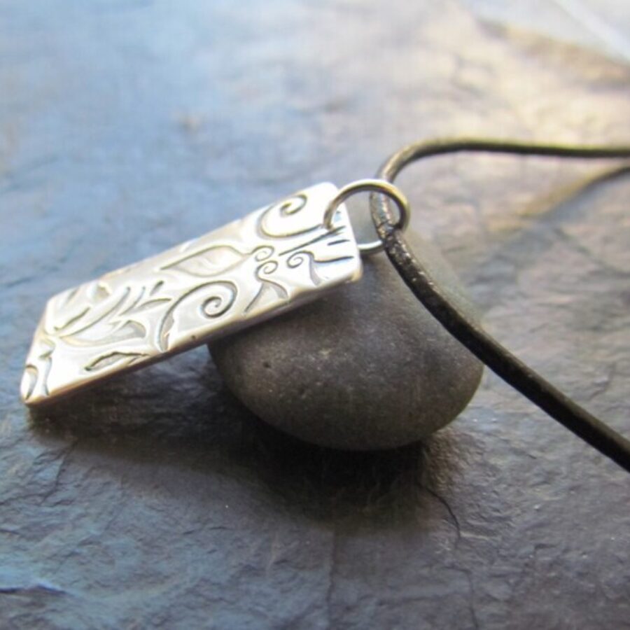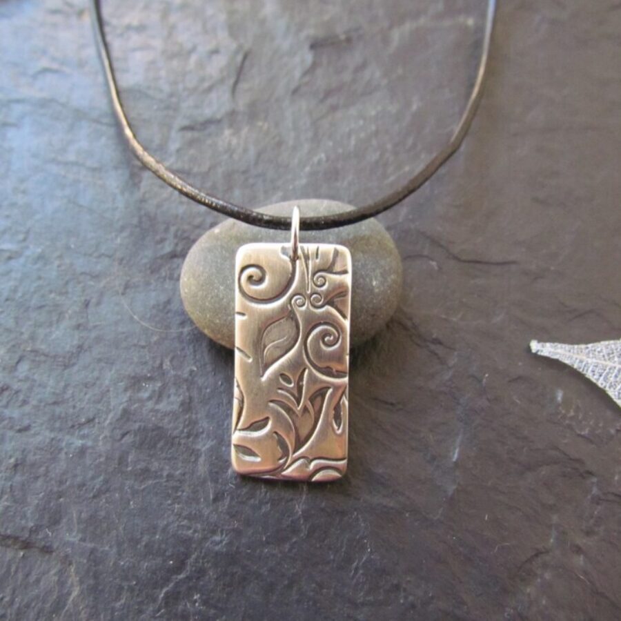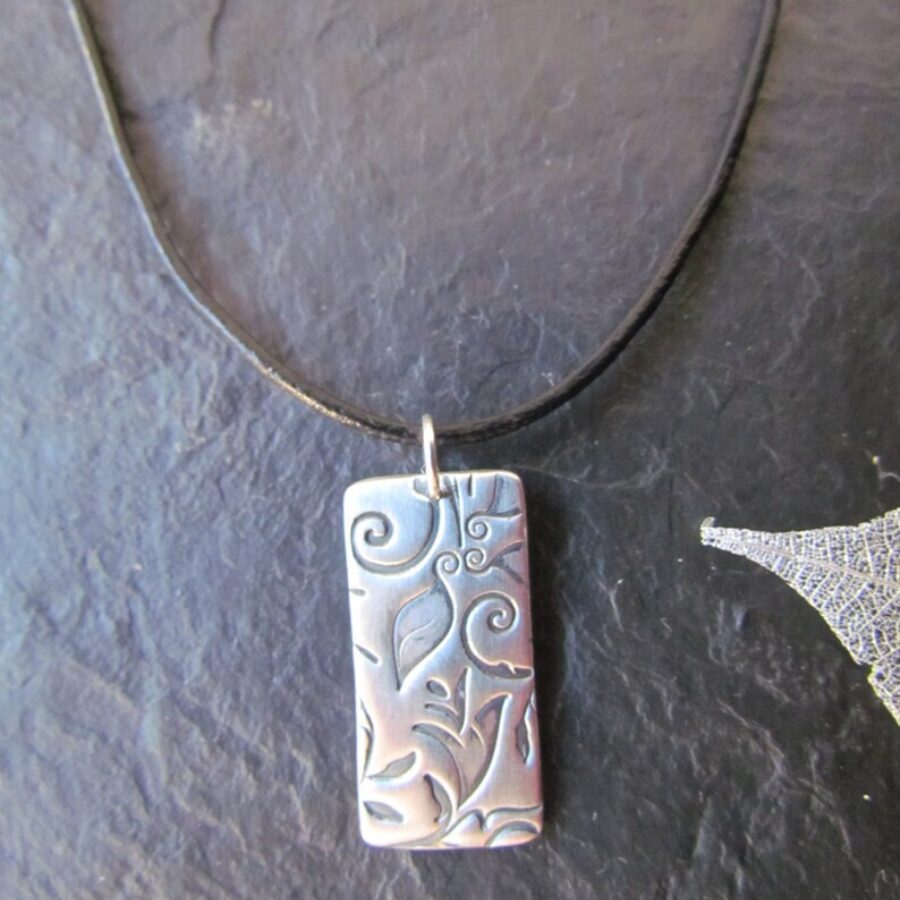 This beautiful nature ingot pendant has an oxidised leaf and flower design inspired by nature which contrasts beautifully with the silver. This unique nature ingot looks stunning hung on black leather cord but could also be hung on your favourite silver chain. The pendant has been carefully handcrafted with love and because this makers pieces are all handmade no two pieces are the same.
