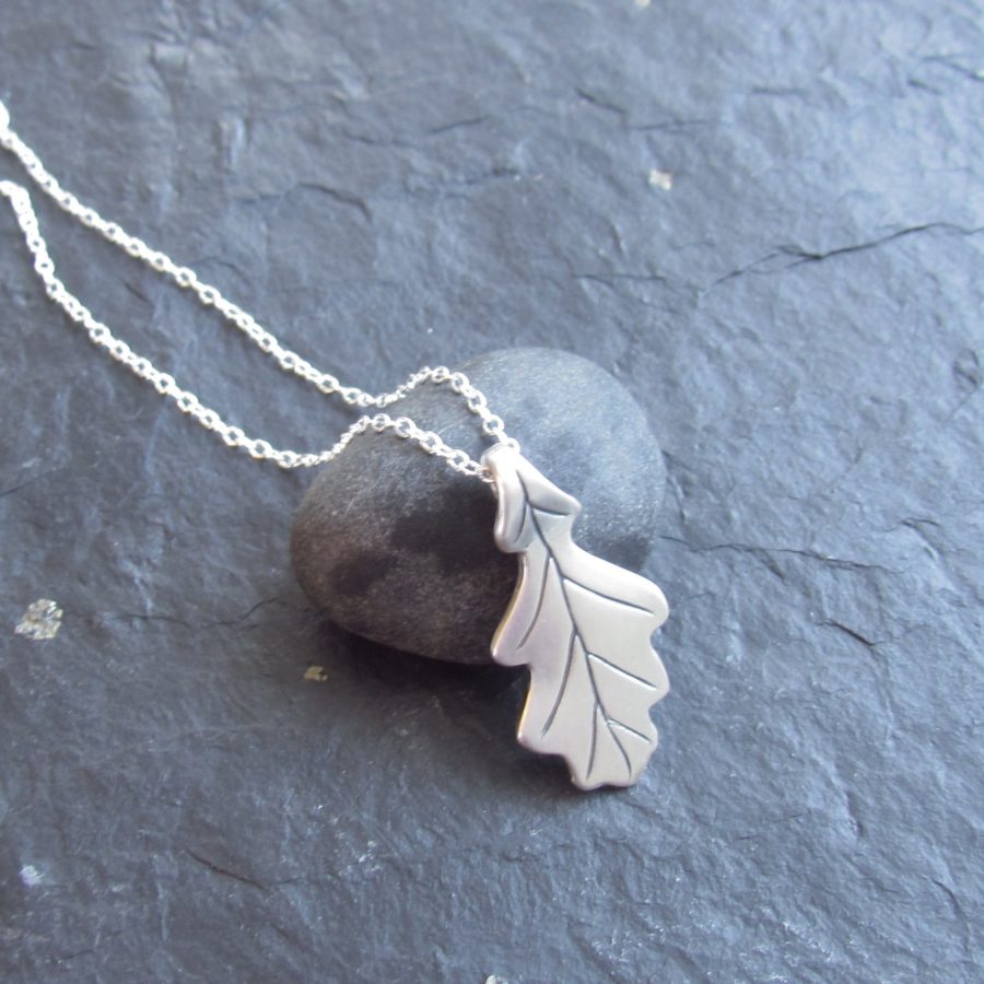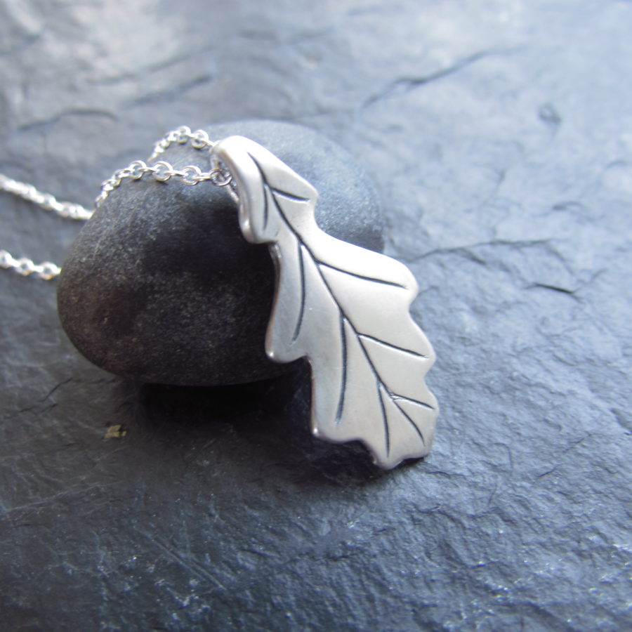 This stunning silver oak leaf pendant has hand carved and oxidised veins and a brushed silver finish. This is a nature inspired design.