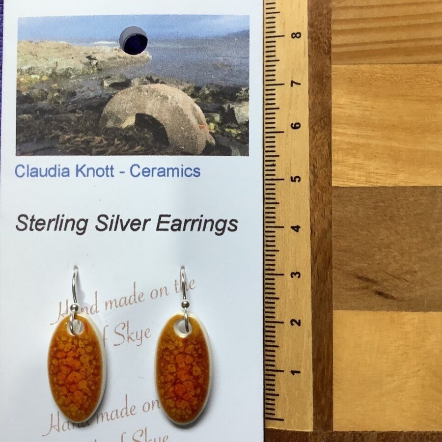 A pair of small oval ceramic earrings with sterling silver ear hooks. The earrings are made of white stoneware clay with an orange ember glaze. These earrings are individually handcrafted with slight variations of glaze, pattern and design.